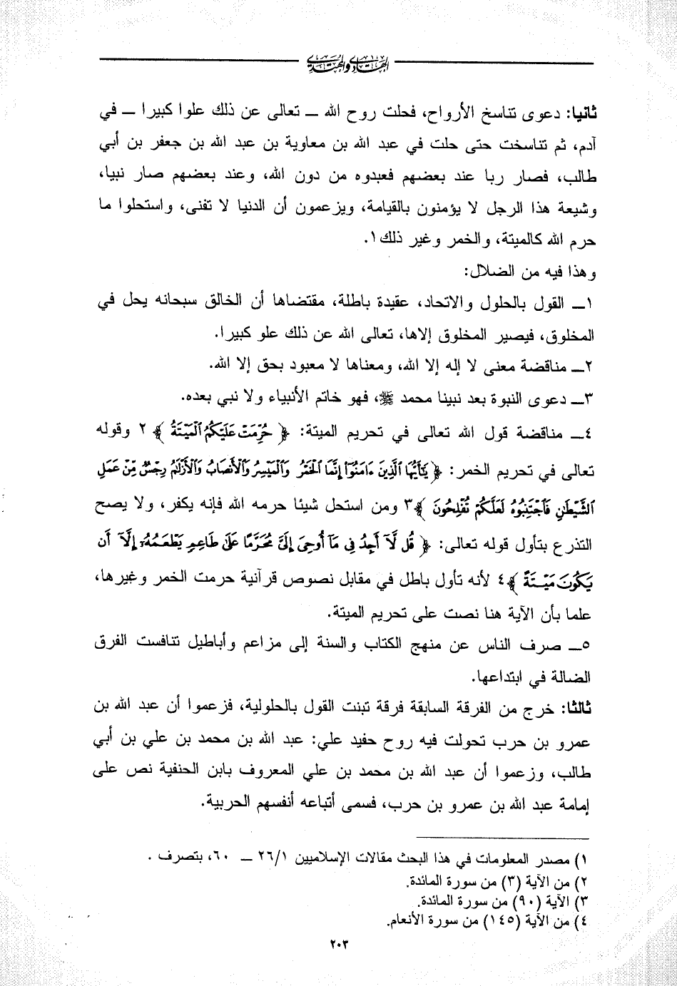 ثانيا: دعوى تناسخ الأرواح، فحلت روح الله - تعالى عن ذلك علوا كبيرا - في آدم، ثم تناسخت حتى حلت في عبد الله بن معاوية بن عبد الله بن جعفر بن أبي طالب، فصار ربا عند بعضهم فعبدوه من دون الله، وعند بعضهم صار نبيا، وشيعة هذا الرجل لا يؤمنون بالقيامة، ويزعمون أن الدنيا لا تفنى، واستحلوا ما حرم الله كالميتة، والخمر وغير ذلك (¬1).