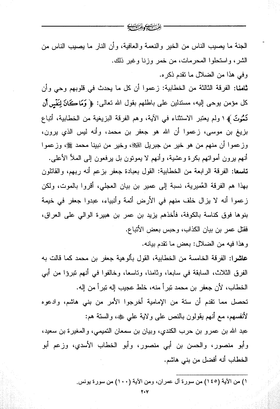 ثامنا: الفرقة الثالثة من الخطابية: زعموا أن كل ما يحدث في قلوبهم وحي وأن كل مؤمن يوحى إليه، مستدلين على باطلهم بقول الله تعالى: {وَمَا كَانَ لِنَفْسٍ أَنْ تَمُوتَ} (¬1) ولم يعتبر الاستثناء في الآية، وهم الفرقة البزيغية من الخطابية، أتباع بزيغ بن موسى، زعموا أن الله هو جعفر بن محمد، وأنه ليس الذي يرون، وزعموا أن منهم من هو خير من جبريل - عليه السلام -، وخير من نبينا محمد - صلى الله عليه وسلم -، وزعموا أنهم يرون أمواتهم بكرة وعشية، وأنهم لا يموتون بل يرفعون إلى الملأ الأعلى.