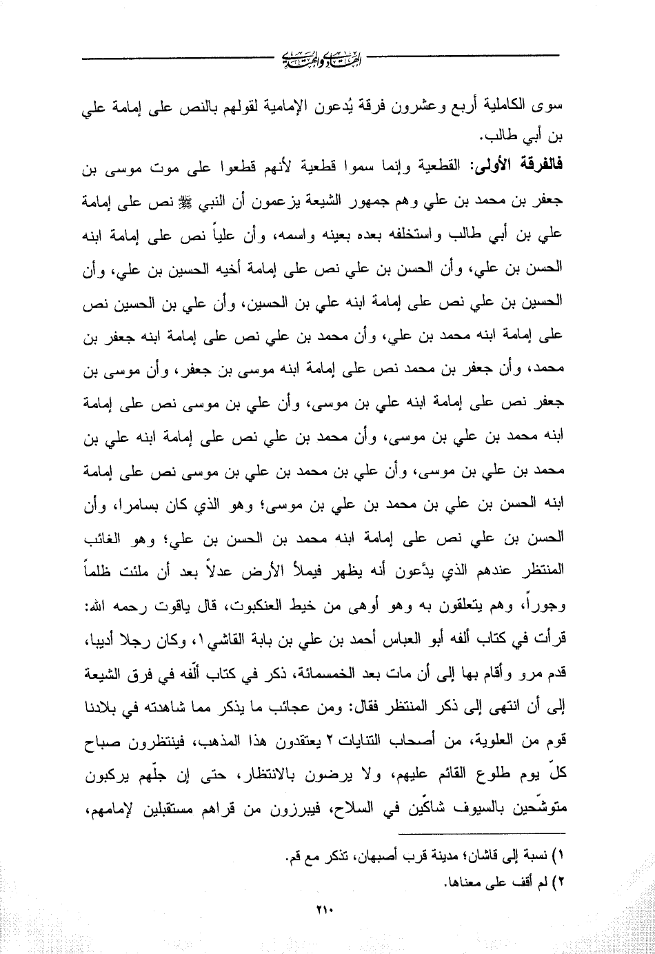 فالفرقة الأولى: القطعية وإنما سموا قطعية لأنهم قطعوا على موت موسى بن جعفر بن محمد بن علي وهم جمهور الشيعة يزعمون أن النبي - صلى الله عليه وسلم - نص على إمامة علي بن أبي طالب واستخلفه بعده بعينه واسمه، وأن علياً نص على إمامة ابنه الحسن بن علي، وأن الحسن بن علي نص على إمامة أخيه الحسين بن علي، وأن الحسين بن علي نص على إمامة ابنه علي بن الحسين، وأن علي بن الحسين نص على إمامة ابنه محمد بن علي، وأن محمد بن علي نص على إمامة ابنه جعفر بن محمد، وأن جعفر بن محمد نص على إمامة ابنه موسى بن جعفر، وأن موسى بن جعفر نص على إمامة ابنه علي بن موسى، وأن علي بن موسى نص على إمامة ابنه محمد بن علي بن موسى، وأن محمد بن علي نص على إمامة ابنه علي بن محمد بن علي بن موسى، وأن علي بن محمد بن علي بن موسى نص على إمامة ابنه الحسن بن علي بن محمد بن علي بن موسى؛ وهو الذي كان بسامرا، وأن الحسن بن علي نص على إمامة ابنه محمد بن الحسن بن علي؛ وهو الغائب المنتظر عندهم الذي يدَّعون أنه يظهر فيملأ الأرض عدلاً بعد أن ملئت ظلماً وجوراً، وهم يتعلقون به وهو أوهى من خيط العنكبوت، قال ياقوت رحمه الله: قرأت في كتاب ألفه أبو العباس أحمد بن علي بن بابة القاشي (¬1)، وكان رجلا أديبا، قدم مرو وأقام بها إلى أن مات بعد الخمسمائة، ذكر في كتاب ألّفه في فرق الشيعة إلى أن انتهى إلى ذكر المنتظر فقال: ومن عجائب ما يذكر مما شاهدته في بلادنا قوم من العلوية، من أصحاب التنايات (¬2) يعتقدون هذا المذهب، فينتظرون صباح كلّ يوم طلوع القائم عليهم، ولا يرضون بالانتظار، حتى إن جلّهم يركبون متوشّحين بالسيوف شاكّين في السلاح، فيبرزون من قراهم مستقبلين لإمامهم،
