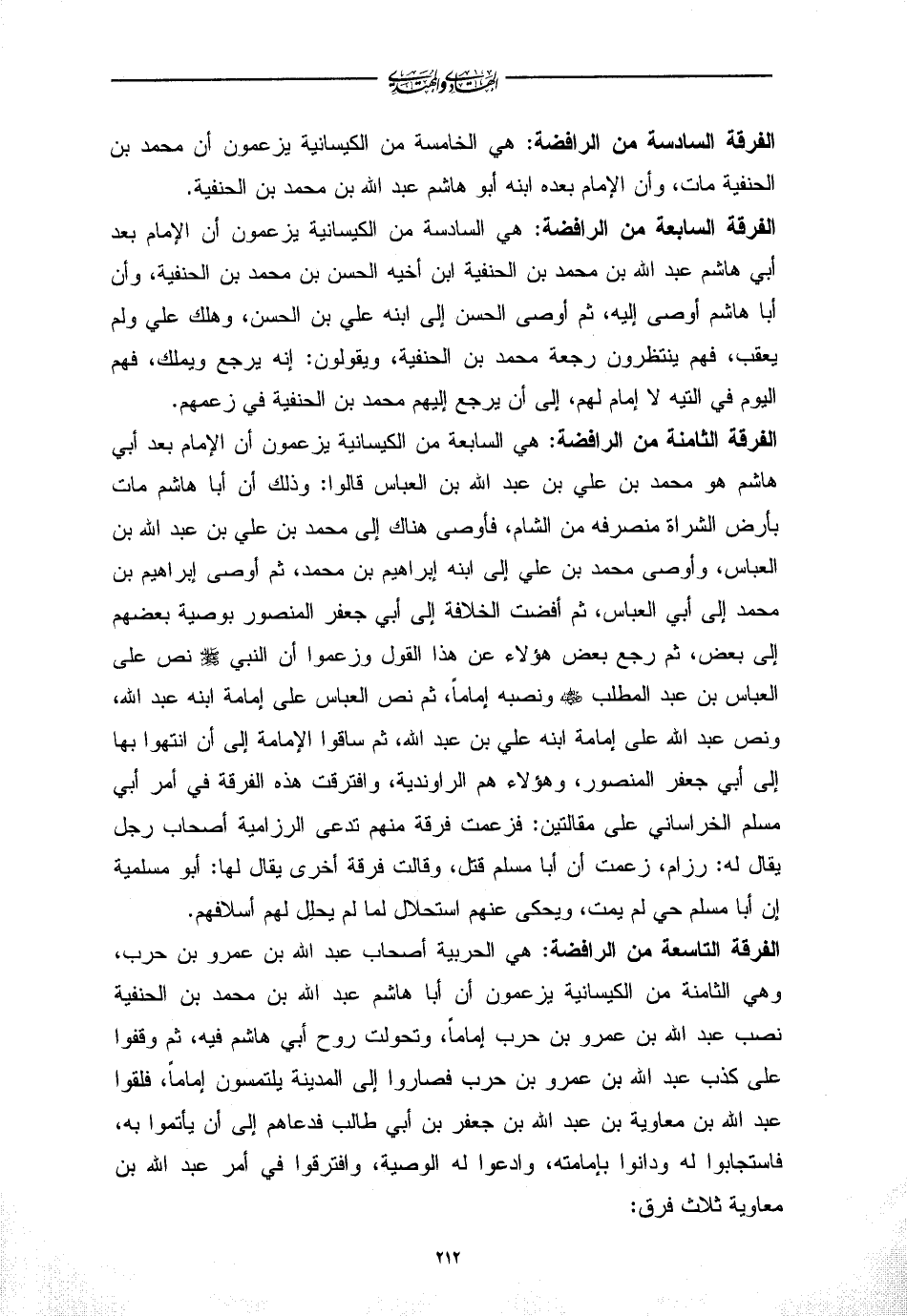 الفرقة السادسة من الرافضة: هي الخامسة من الكيسانية يزعمون أن محمد بن الحنفية مات، وأن الإمام بعده ابنه أبو هاشم عبد الله بن محمد بن الحنفية.