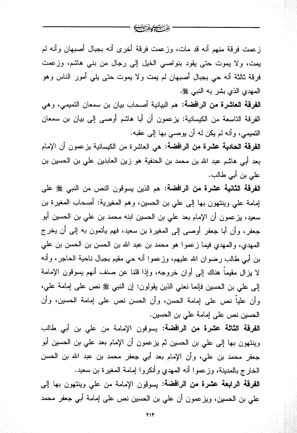 الفرقة الثاثة عشرة من الرافضة: يسوقون الإمامة من علي بن أبي طالب وينتهون بها إلى علي بن الحسين ثم يزعمون أن الإمام بعد علي بن الحسين أبو جعفر محمد بن علي، وأن الإمام بعد أبي جعفر محمد بن عبد الله بن الحسن الخارج بالمدينة، وزعموا أنه المهدي وأنكروا إمامة المغيرة بن سعيد.