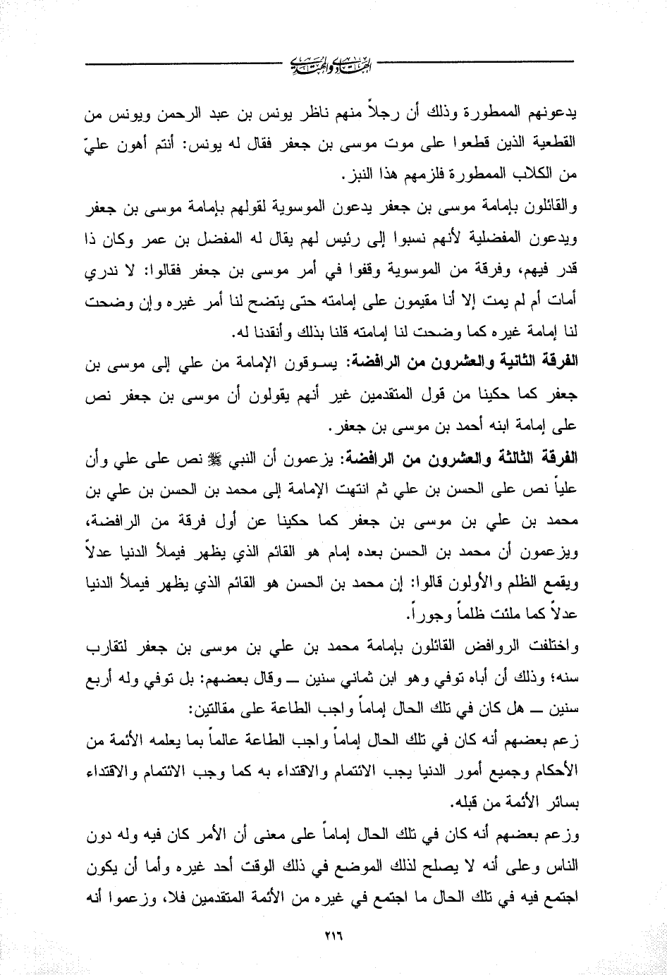 الفرقة الثالثة والعشرون من الرافضة: يسوقون الإمامة من علي إلى موسى بن جعفر كما حكينا من قول المتقدمين غير أنهم يقولون أن موسى بن جعفر نص على إمامة ابنه أحمد بن موسى بن جعفر.