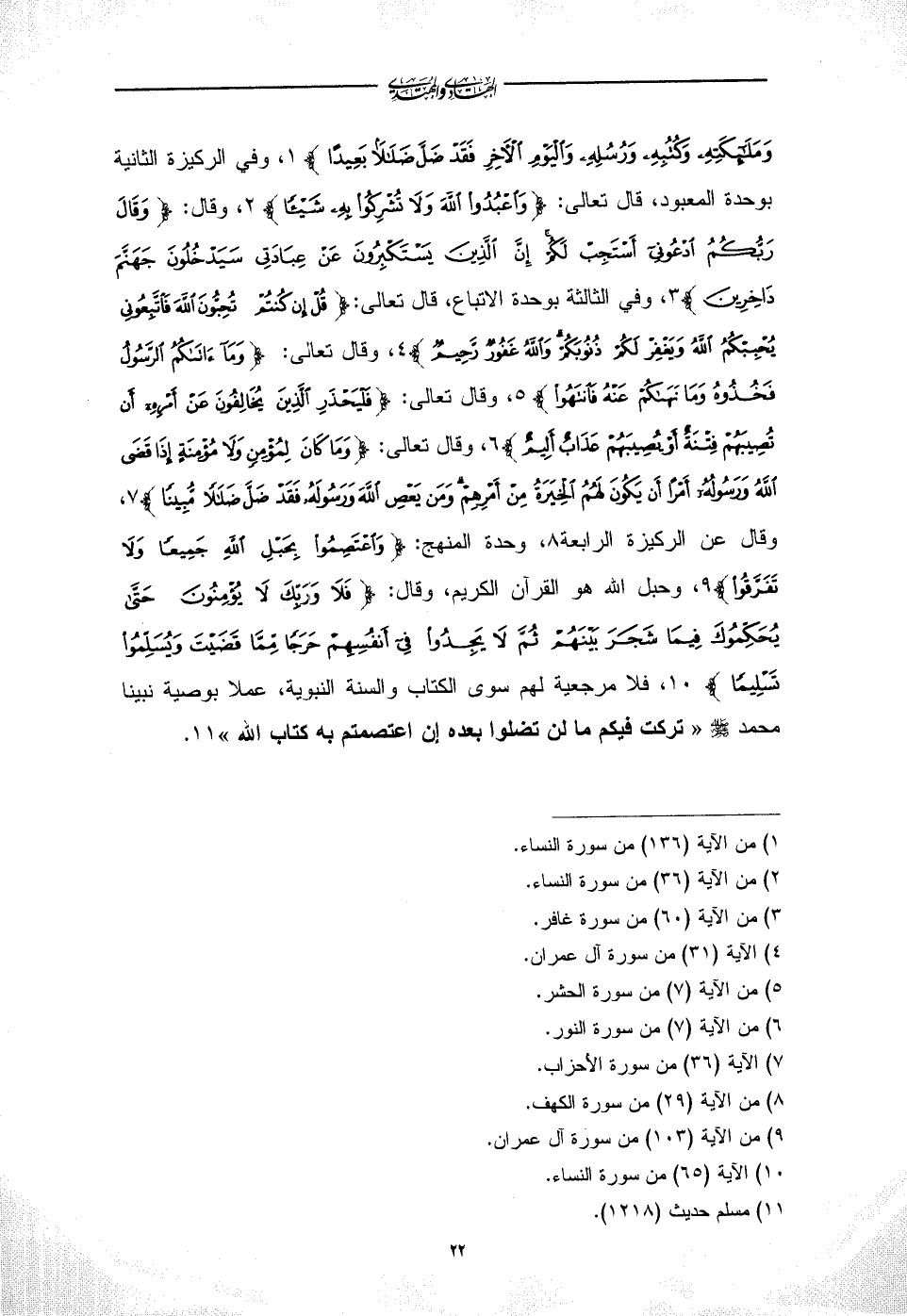 وَمَلَائِكَتِهِ وَكُتُبِهِ وَرُسُلِهِ وَالْيَوْمِ الْآخِرِ فَقَدْ ضَلَّ ضَلَالًا بَعِيدًا} (¬1)، وفي الركيزة الثانية بوحدة المعبود، قال تعالى: {وَاعْبُدُوا اللَّهَ وَلَا تُشْرِكُوا بِهِ شَيْئًا} (¬2)، وقال: {وَقَالَ رَبُّكُمُ ادْعُونِي أَسْتَجِبْ لَكُمْ إِنَّ الَّذِينَ يَسْتَكْبِرُونَ عَنْ عِبَادَتِي سَيَدْخُلُونَ جَهَنَّمَ دَاخِرِينَ} (¬3)، وفي الثالثة بوحدة الاتباع، قال تعالى: {قُلْ إِنْ كُنْتُمْ تُحِبُّونَ اللَّهَ فَاتَّبِعُونِي يُحْبِبْكُمُ اللَّهُ وَيَغْفِرْ لَكُمْ ذُنُوبَكُمْ وَاللَّهُ غَفُورٌ رَحِيمٌ} (¬4)، وقال تعالى: {وَمَا آتَاكُمُ الرَّسُولُ فَخُذُوهُ وَمَا نَهَاكُمْ عَنْهُ فَانْتَهُوا} (¬5)، وقال تعالى: {فَلْيَحْذَرِ الَّذِينَ يُخَالِفُونَ عَنْ أَمْرِهِ أَنْ تُصِيبَهُمْ فِتْنَةٌ أَوْ يُصِيبَهُمْ عَذَابٌ أَلِيمٌ} (¬6)، وقال تعالى: {وَمَا كَانَ لِمُؤْمِنٍ وَلَا مُؤْمِنَةٍ إِذَا قَضَى اللَّهُ وَرَسُولُهُ أَمْرًا أَنْ يَكُونَ لَهُمُ الْخِيَرَةُ مِنْ أَمْرِهِمْ وَمَنْ يَعْصِ اللَّهَ وَرَسُولَهُ فَقَدْ ضَلَّ ضَلَالًا مُبِينًا} (¬7)، وقال عن الركيزة الرابعة (¬8)، وحدة المنهج: {وَاعْتَصِمُوا بِحَبْلِ اللَّهِ جَمِيعًا وَلَا تَفَرَّقُوا} (¬9)، وحبل الله هو القرآن الكريم، وقال: {فَلَا وَرَبِّكَ لَا يُؤْمِنُونَ حَتَّى يُحَكِّمُوكَ فِيمَا شَجَرَ بَيْنَهُمْ ثُمَّ لَا يَجِدُوا فِي أَنْفُسِهِمْ حَرَجًا مِمَّا قَضَيْتَ وَيُسَلِّمُوا تَسْلِيمًا} (¬10)، فلا مرجعية لهم سوى الكتاب والسنة النبوية، عملا بوصية نبينا محمد - صلى الله عليه وسلم - «تركت فيكم ما لن تضلوا بعده إن اعتصمتم به كتاب الله» (¬11).