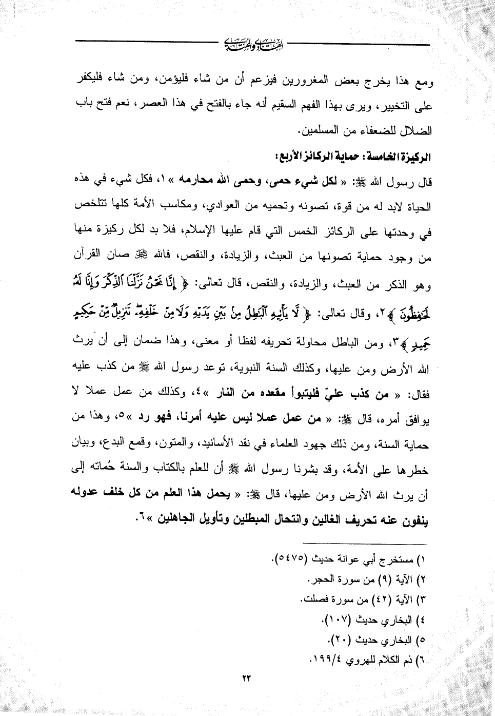 قال رسول الله - صلى الله عليه وسلم -: «لكل شيء حمى، وحمى الله محارمه» (¬1)، فكل شيء في هذه الحياة لابد له من قوة، تصونه وتحميه من العوادي، ومكاسب الأمة كلها تتلخص في وحدتها على الركائز الخمس التي قام عليها الإسلام، فلا بد لكل ركيزة منها من وجود حماية تصونها من العبث، والزيادة، والنقص، فالله - عز وجل - صان القرآن وهو الذكر من العبث، والزيادة، والنقص، قال تعالى: {إِنَّا نَحْنُ نَزَّلْنَا الذِّكْرَ وَإِنَّا لَهُ لَحَافِظُونَ} (¬2)، وقال تعالى: {لَا يَأْتِيهِ الْبَاطِلُ مِنْ بَيْنِ يَدَيْهِ وَلَا مِنْ خَلْفِهِ تَنْزِيلٌ مِنْ حَكِيمٍ حَمِيدٍ} (¬3)، ومن الباطل محاولة تحريفه لفظا أو معنى، وهذا ضمان إلى أن يرث الله الأرض ومن عليها، وكذلك السنة النبوية، توعد رسول الله - صلى الله عليه وسلم - من كذب عليه فقال: «من كذب عليّ فليتبوأ مقعده من النار» (¬4)، وكذلك من عمل عملا لا يوافق أمره، قال - صلى الله عليه وسلم -: «من عمل عملا ليس عليه أمرنا، فهو رد» (¬5)، وهذا من حماية السنة، ومن ذلك جهود العلماء في نقد الأسانيد، والمتون، وقمع البدع، وبيان خطرها على الأمة، وقد بشرنا رسول الله - صلى الله عليه وسلم - أن للعلم بالكتاب والسنة حُماته إلى أن يرث الله الأرض ومن عليها، قال - صلى الله عليه وسلم -: «يحمل هذا العلم من كل خلف عدوله ينفون عنه تحريف الغالين وانتحال المبطلين وتأويل الجاهلين» (¬6).