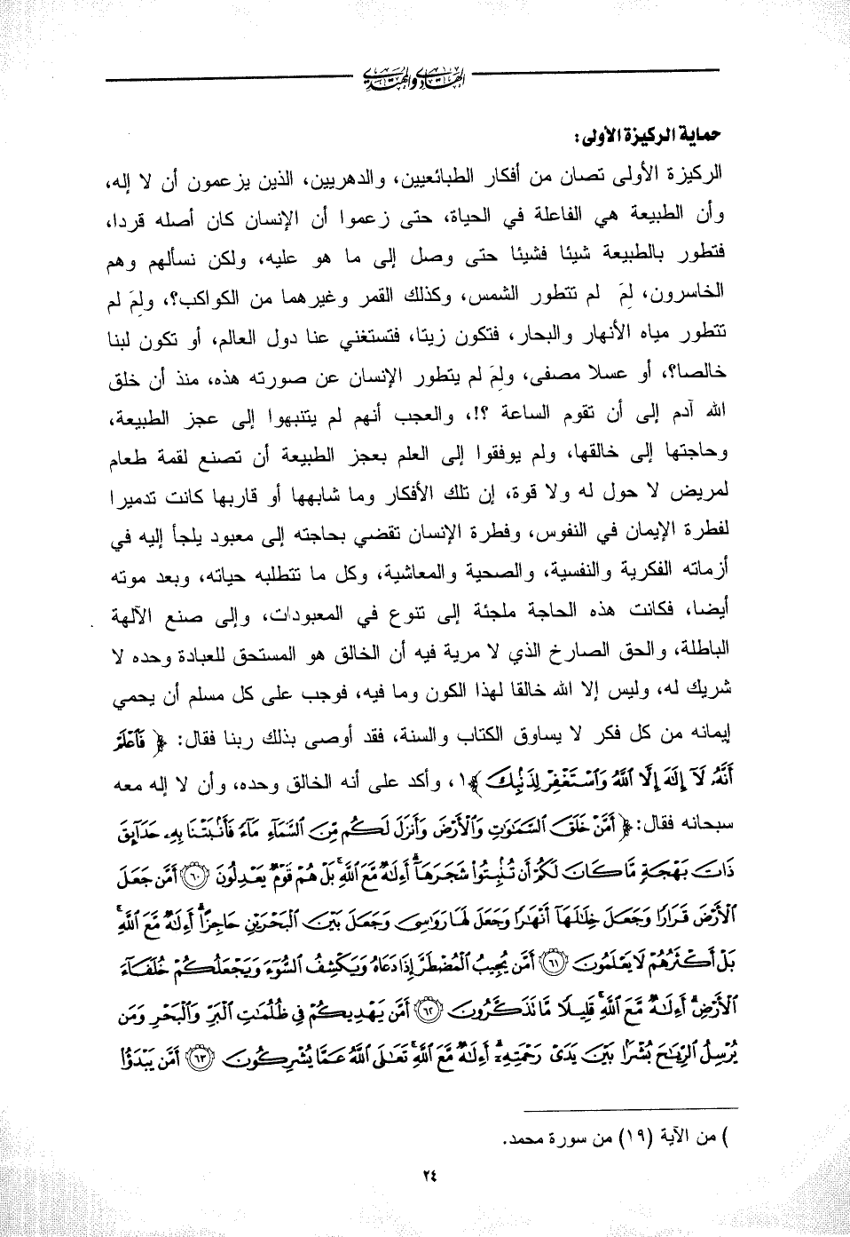 الركيزة الأولى تصان من أفكار الطبائعيين، والدهريين، الذين يزعمون أن لا إله، وأن الطبيعة هي الفاعلة في الحياة، حتى زعموا أن الإنسان كان أصله قردا، فتطور بالطبيعة شيئا فشيئا حتى وصل إلى ما هو عليه، ولكن نسألهم وهم الخاسرون، لِمَ لم تتطور الشمس، وكذلك القمر وغيرهما من الكواكب؟ ، ولِمَ لم تتطور مياه الأنهار والبحار، فتكون زيتا، فتستغني عنا دول العالم، أو تكون لبنا خالصا؟ ، أو عسلا مصفى، ولِمَ لم يتطور الإنسان عن صورته هذه، منذ أن خلق الله آدم إلى أن تقوم الساعة؟ ! ، والعجب أنهم لم يتنبهوا إلى عجز الطبيعة، وحاجتها إلى خالقها، ولم يوفقوا إلى العلم بعجز الطبيعة أن تصنع لقمة طعام لمريض لا حول له ولا قوة، إن تلك الأفكار وما شابهها أو قاربها كانت تدميرا لفطرة الإيمان في النفوس، وفطرة الإنسان تقضي بحاجته إلى معبود يلجأ إليه في أزماته الفكرية والنفسية، والصحية والمعاشية، وكل ما تتطلبه حياته، وبعد موته أيضا، فكانت هذه الحاجة ملجئة إلى تنوع في المعبودات، وإلى صنع الآلهة الباطلة، والحق الصارخ الذي لا مرية فيه أن الخالق هو المستحق للعبادة وحده لا شريك له، وليس إلا الله خالقا لهذا الكون وما فيه، فوجب على كل مسلم أن يحمي إيمانه من كل فكر لا يساوق الكتاب والسنة، فقد أوصى بذلك ربنا فقال: {فَاعْلَمْ أَنَّهُ لَا إِلَهَ إِلَّا اللَّهُ وَاسْتَغْفِرْ لِذَنْبِكَ} (¬1)، وأكد على أنه الخالق وحده، وأن لا إله معه سبحانه فقال: {أَمَّنْ خَلَقَ السَّمَاوَاتِ وَالْأَرْضَ وَأَنْزَلَ لَكُمْ مِنَ السَّمَاءِ مَاءً فَأَنْبَتْنَا بِهِ حَدَائِقَ ذَاتَ بَهْجَةٍ مَا كَانَ لَكُمْ أَنْ تُنْبِتُوا شَجَرَهَا أَإِلَهٌ مَعَ اللَّهِ بَلْ هُمْ قَوْمٌ يَعْدِلُونَ (60) أَمَّنْ جَعَلَ الْأَرْضَ قَرَارًا وَجَعَلَ خِلَالَهَا أَنْهَارًا وَجَعَلَ لَهَا رَوَاسِيَ وَجَعَلَ بَيْنَ الْبَحْرَيْنِ حَاجِزًا أَإِلَهٌ مَعَ اللَّهِ بَلْ أَكْثَرُهُمْ لَا يَعْلَمُونَ (61) أَمَّنْ يُجِيبُ الْمُضْطَرَّ إِذَا دَعَاهُ وَيَكْشِفُ السُّوءَ وَيَجْعَلُكُمْ خُلَفَاءَ الْأَرْضِ أَإِلَهٌ مَعَ اللَّهِ قَلِيلًا مَا تَذَكَّرُونَ (62) أَمَّنْ يَهْدِيكُمْ فِي ظُلُمَاتِ الْبَرِّ وَالْبَحْرِ وَمَنْ يُرْسِلُ الرِّيَاحَ بُشْرًا بَيْنَ يَدَيْ رَحْمَتِهِ أَإِلَهٌ مَعَ اللَّهِ تَعَالَى اللَّهُ عَمَّا يُشْرِكُونَ (63) أَمَّنْ يَبْدَأُ