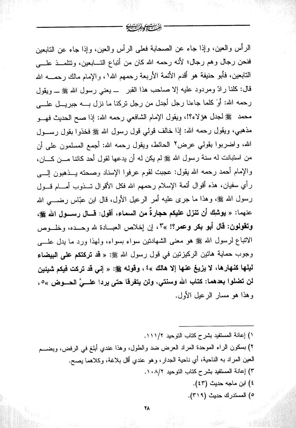 الرأس والعين، وإذا جاء عن الصحابة فعلى الرأس والعين، وإذا جاء عن التابعين فنحن رجال وهم رجال؛ لأنه رحمه الله كان من أتباع التابعين، وتتلمذ على التابعين، فأبو حنيفة هو أقدم الأئمة الأربعة رحمهم الله (¬1)، والإمام مالك رحمه الله قال: كلنا رادّ ومردود عليه إلا صاحب هذا القبر - يعني رسول الله - صلى الله عليه وسلم - - ويقول رحمه الله: أوَ كلما جاءنا رجل أجدل من رجل تركنا ما نزل به جبريل على محمد - صلى الله عليه وسلم - لجدل هؤلاء؟ ! ، ويقول الإمام الشافعي رحمه الله: إذا صح الحديث فهو مذهبي، ويقول رحمه الله: إذا خالف قولي قول رسول الله - صلى الله عليه وسلم - فخذوا بقول رسول الله، واضربوا بقولي عرض (¬2) الحائط، ويقول رحمه الله: أجمع المسلمون على أن من استبانت له سنة رسول الله - صلى الله عليه وسلم - لم يكن له أن يدعها لقول أحد كائنا من كان، والإمام أحمد رحمه الله يقول: عجبت لقوم عرفوا الإسناد وصحته يذهبون إلى رأي سفيان، هذه أقوال أئمة الإسلام رحمهم الله فكل الأقوال تذوب أمام قول رسول الله - صلى الله عليه وسلم -، وهذا ما جرى عليه أمر الرعيل الأول، قال ابن عبّاس رضي الله عنهما: «يوشِك أن تنزل عليكم حجارةٌ من السماء، أقول: قال رسول الله - صلى الله عليه وسلم -، وتقولون: قال أبو بكر وعمر؟ ! » (¬3)، إن إخلاص العبادة لله وحده، وخلوص الاتباع لرسول الله - صلى الله عليه وسلم - هو معنى الشهادتين سواء بسواء، ولهذا ورد ما يدل على وجوب حماية هاتين الركيزتين في قول رسول الله - صلى الله عليه وسلم -: «قد تركتكم على البيضاء ليلها كنهارها، لا يزيغ عنها إلا هالك» (¬4)، وقوله - صلى الله عليه وسلم -: «إني قد تركت فيكم شيئين لن تضلوا بعدهما: كتاب الله وسنتي، ولن يتفرقا حتى يردا عليَّ الحوض» (¬5)، وهذا هو مسار الرعيل الأول.