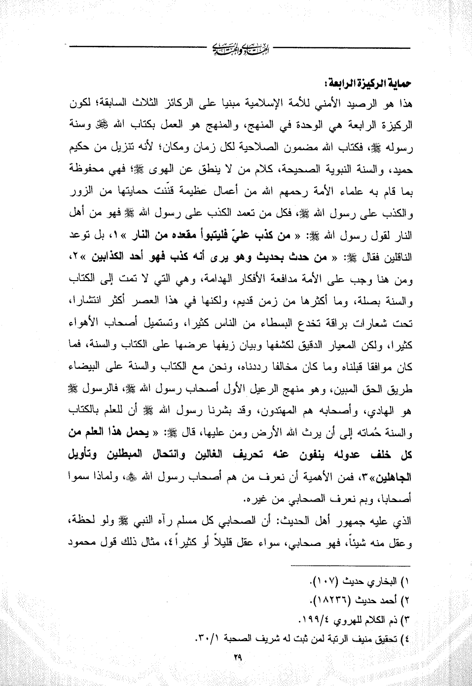 هذا هو الرصيد الأمني للأمة الإسلامية مبنيا على الركائز الثلاث السابقة؛ لكون الركيزة الرابعة هي الوحدة في المنهج، والمنهج هو العمل بكتاب الله - عز وجل - وسنة رسوله - صلى الله عليه وسلم -، فكتاب الله مضمون الصلاحية لكل زمان ومكان؛ لأنه تنزيل من حكيم حميد، والسنة النبوية الصحيحة، كلام من لا ينطق عن الهوى - صلى الله عليه وسلم -؛ فهي محفوظة بما قام به علماء الأمة رحمهم الله من أعمال عظيمة قنّنت حمايتها من الزور والكذب على رسول الله - صلى الله عليه وسلم -، فكل من تعمد الكذب على رسول الله - صلى الله عليه وسلم - فهو من أهل النار لقول رسول الله - صلى الله عليه وسلم -: «من كذب عليّ فليتبوأ مقعده من النار» (¬1)، بل توعد الناقلين فقال - صلى الله عليه وسلم -: «من حدث بحديث وهو يرى أنه كذب فهو أحد الكذابين» (¬2)، ومن هنا وجب على الأمة مدافعة الأفكار الهدامة، وهي التي لا تمت إلى الكتاب والسنة بصلة، وما أكثرها من زمن قديم، ولكنها في هذا العصر أكثر انتشارا، تحت شعارات براقة تخدع البسطاء من الناس كثيرا، وتستميل أصحاب الأهواء كثيرا، ولكن المعيار الدقيق لكشفها وبيان زيفها عرضها على الكتاب والسنة، فما كان موافقا قبلناه وما كان مخالفا رددناه، ونحن مع الكتاب والسنة على البيضاء طريق الحق المبين، وهو منهج الرعيل الأول أصحاب رسول الله - صلى الله عليه وسلم -، فالرسول - صلى الله عليه وسلم - هو الهادي، وأصحابه هم المهتدون، وقد بشرنا رسول الله - صلى الله عليه وسلم - أن للعلم بالكتاب والسنة حُماته إلى أن يرث الله الأرض ومن عليها، قال - صلى الله عليه وسلم -: «يحمل هذا العلم من كل خلف عدوله ينفون عنه تحريف الغالين وانتحال المبطلين وتأويل الجاهلين» (¬3)، فمن الأهمية أن نعرف من هم أصحاب رسول الله - رضي الله عنهم -، ولماذا سموا أصحابا، وبم نعرف الصحابي من غيره.