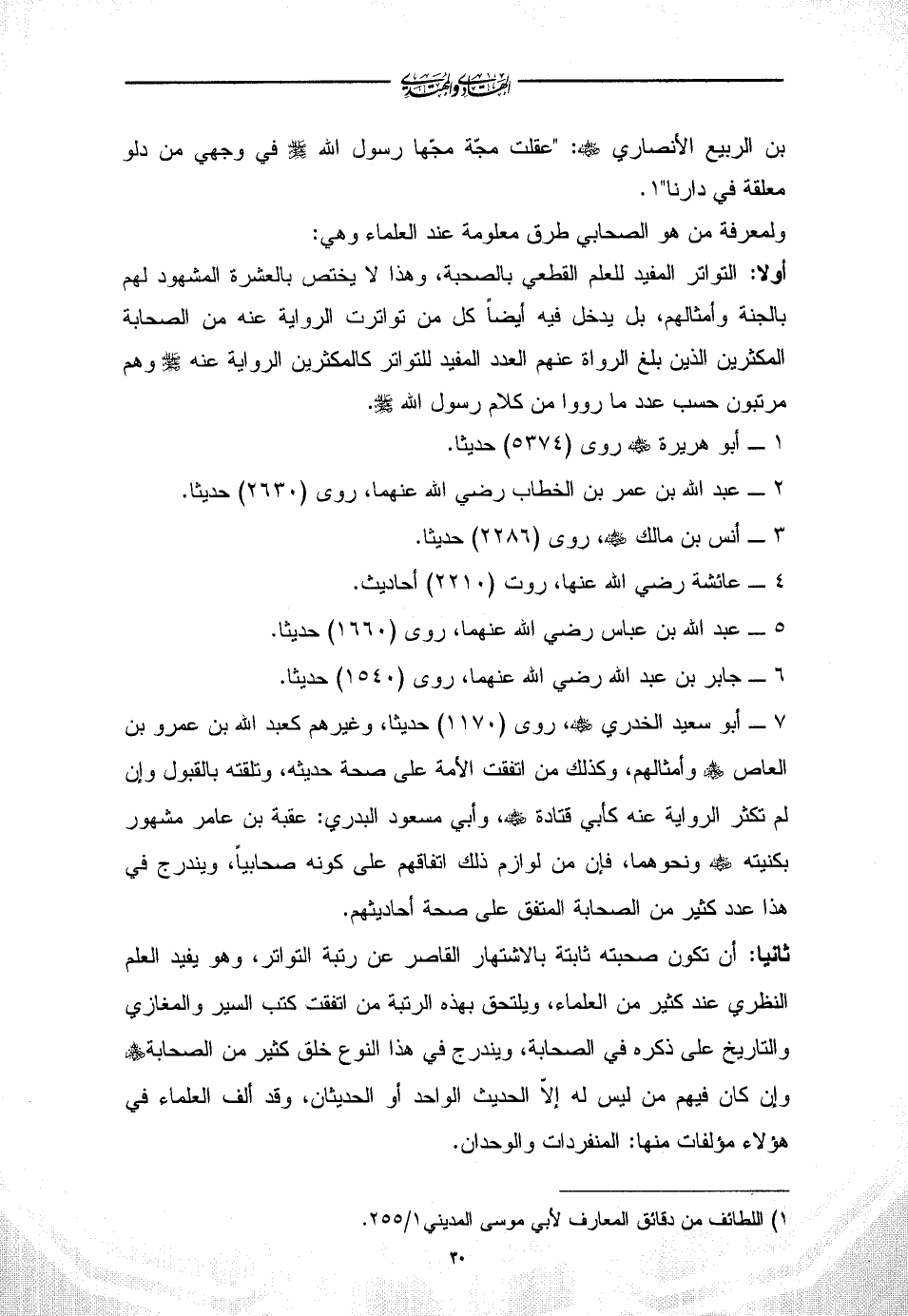 7 - أبو سعيد الخدري - رضي الله عنه -، روى (1170) حديثا، وغيرهم كعبد الله بن عمرو بن العاص - رضي الله عنهم - وأمثالهم، وكذلك من اتفقت الأمة على صحة حديثه، وتلقته بالقبول وإن لم تكثر الرواية عنه كأبي قتادة - رضي الله عنه -، وأبي مسعود البدري: عقبة بن عامر مشهور بكنيته - رضي الله عنه - ونحوهما، فإن من لوازم ذلك اتفاقهم على كونه صحابياً، ويندرج في هذا عدد كثير من الصحابة المتفق على صحة أحاديثهم.