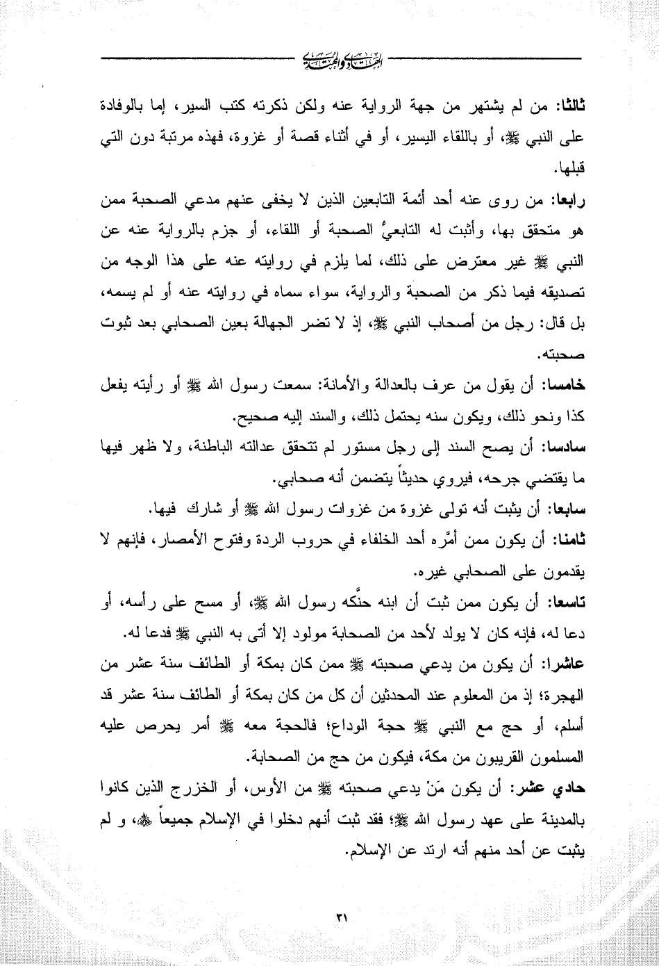عاشرا: أن يكون من يدعي صحبته - صلى الله عليه وسلم - ممن كان بمكة أو الطائف سنة عشر من الهجرة؛ إذ من المعلوم عند المحدثين أن كل من كان بمكة أو الطائف سنة عشر قد أسلم، أو حج مع النبي - صلى الله عليه وسلم - حجة الوداع؛ فالحجة معه - صلى الله عليه وسلم - أمر يحرص عليه المسلمون القريبون من مكة، فيكون من حج من الصحابة.