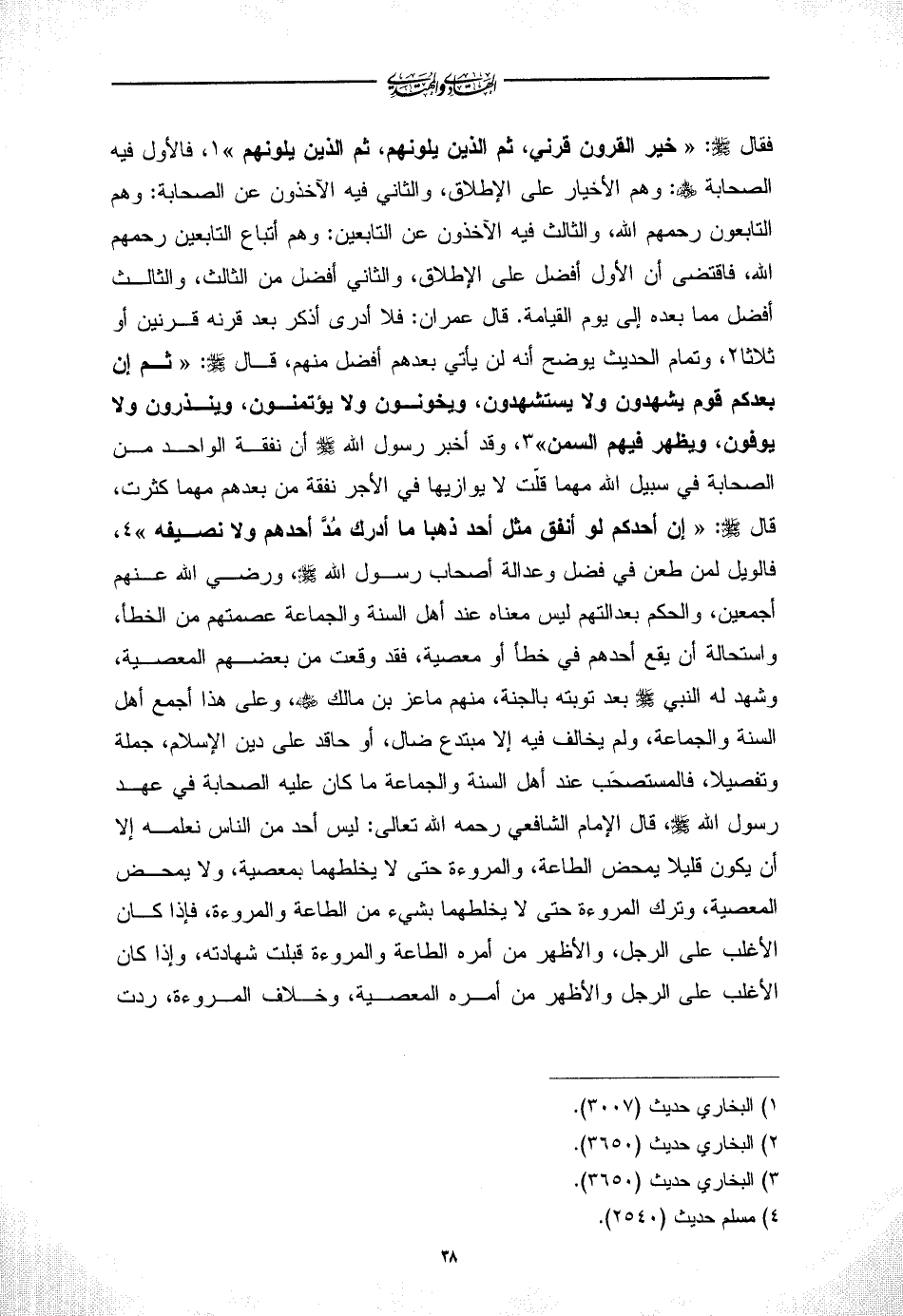 فقال - صلى الله عليه وسلم -: «خير القرون قرني، ثم الذين يلونهم، ثم الذين يلونهم» (¬1)، فالأول فيه الصحابة - رضي الله عنهم -: وهم الأخيار على الإطلاق، والثاني فيه الآخذون عن الصحابة: وهم التابعون رحمهم الله، والثالث فيه الآخذون عن التابعين: وهم أتباع التابعين رحمهم الله، فاقتضى أن الأول أفضل على الإطلاق، والثاني أفضل من الثالث، والثالث أفضل مما بعده إلى يوم القيامة. قال عمران: فلا أدرى أذكر بعد قرنه قرنين أو ثلاثا (¬2)، وتمام الحديث يوضح أنه لن يأتي بعدهم أفضل منهم، قال - صلى الله عليه وسلم -: «ثم إن بعدكم قوم يشهدون ولا يستشهدون، ويخونون ولا يؤتمنون، وينذرون ولا يوفون، ويظهر فيهم السمن» (¬3)، وقد أخبر رسول الله - صلى الله عليه وسلم - أن نفقة الواحد من الصحابة في سبيل الله مهما قلّت لا يوازيها في الأجر نفقة من بعدهم مهما كثرت، قال - صلى الله عليه وسلم -: «إن أحدكم لو أنفق مثل أحد ذهبا ما أدرك مُدَّ أحدهم ولا نصيفه» (¬4)، فالويل لمن طعن في فضل وعدالة أصحاب رسول الله - صلى الله عليه وسلم -، ورضي الله عنهم أجمعين، والحكم بعدالتهم ليس معناه عند أهل السنة والجماعة عصمتهم من الخطأ، واستحالة أن يقع أحدهم في خطأ أو معصية، فقد وقعت من بعضهم المعصية، وشهد له النبي - صلى الله عليه وسلم - بعد توبته بالجنة، منهم ماعز بن مالك - رضي الله عنه -، وعلى هذا أجمع أهل السنة والجماعة، ولم يخالف فيه إلا مبتدع ضال، أو حاقد على دين الإسلام، جملة وتفصيلا، فالمستصحَب عند أهل السنة والجماعة ما كان عليه الصحابة في عهد رسول الله - صلى الله عليه وسلم -، قال الإمام الشافعي رحمه الله تعالى: ليس أحد من الناس نعلمه إلا أن يكون قليلا يمحض الطاعة، والمروءة حتى لا يخلطهما بمعصية، ولا يمحض المعصية، وترك المروءة حتى لا يخلطهما بشيء من الطاعة والمروءة، فإذا كان الأغلب على الرجل، والأظهر من أمره الطاعة والمروءة قبلت شهادته، وإذا كان الأغلب على الرجل والأظهر من أمره المعصية، وخلاف المروءة، ردت