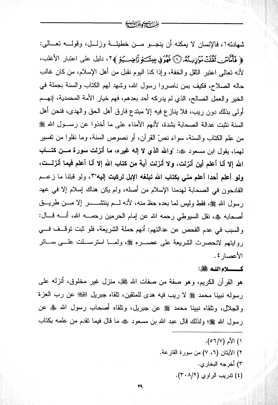 شهادته (¬1)، فالإنسان لا يمكنه أن ينجو من خطيئة وزلل، وقوله تعالى: {فَأَمَّا مَنْ ثَقُلَتْ مَوَازِينُهُ (6) فَهُوَ فِي عِيشَةٍ رَاضِيَةٍ} (¬2)، دليل على اعتبار الأغلب، لأنه تعالى اعتبر الثقل والخفة، وإذا كنا اليوم نقبل من أهل الإسلام، من كان غالب حاله الصلاح، فكيف بمن ناصروا رسول الله، وشهد لهم الكتاب والسنة بجملة في الخير والعمل الصالح، الذي لم يدركه أحد بعدهم، فهم خيار الأمة المحمدية، إنهم أولى بذلك دون ريب، فلا ينازع فيه إلا مبتدع فارق أهل الحق والهدى، فنحن أهل السنة نثبت عدالة الصحابة بشدة، لأنهم الأمناء على ما أخذوا عن رسول الله - صلى الله عليه وسلم - من علم الكتاب والسنة، سواء نصّ القرآن، أو نصوص السنة، وما نقلوا من تفسير لهما، يقول ابن مسعود - رضي الله عنه -: "والله الذي لا إله غيره، ما أنزلت سورة من كتاب الله إلا أنا أعلم أين أنزلت، ولا أنزلت آية من كتاب الله إلا أنا أعلم فيما أنزلت، ولو أعلم أحدا أعلم مني بكتاب الله تبلغه الإبل لركبت إليه" (¬3)، ولو قبلنا ما زعم القادحون في الصحابة لهدمنا الإسلام من أصله، ولم يكن هناك إسلام إلا في عهد رسول الله - صلى الله عليه وسلم -، فقط وليس لما بعده حظ منه، لأنه لم ينتشر إلا من طريق أصحابه - رضي الله عنهم -، نقل السيوطي رحمه الله عن إمام الحرمين رحمه الله، أنه قال: والسبب في عدم الفحص عن عدالتهم: أنهم حملة الشريعة، فلو ثبت توقف في روايتهم لانحصرت الشريعة على عصره - صلى الله عليه وسلم -، ولما استرسلت على سائر الأعصار (¬4).