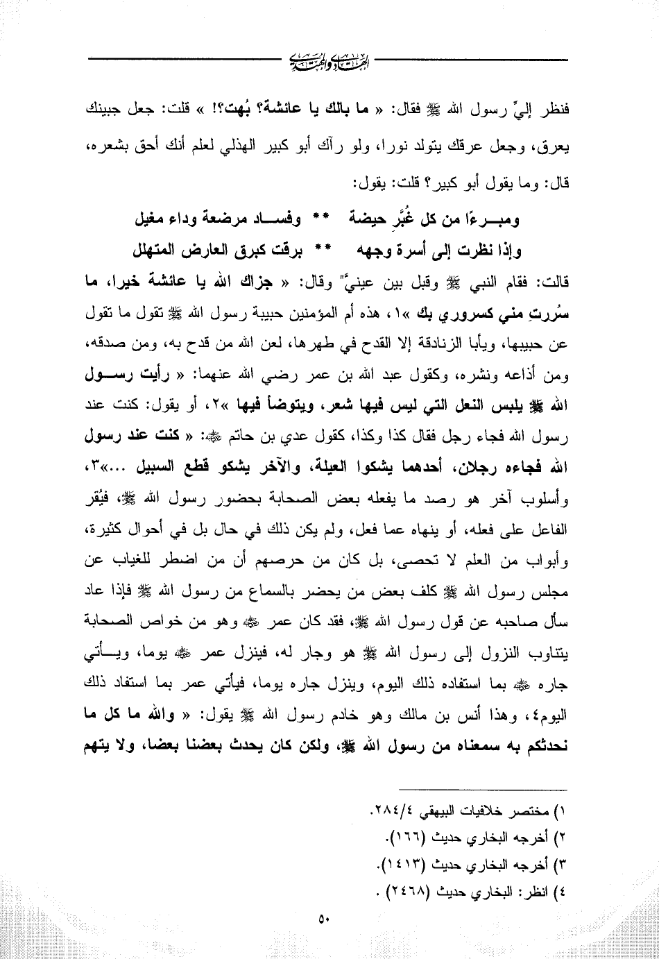 قالت: فقام النبي - صلى الله عليه وسلم - وقبل بين عينيَّ" وقال: «جزاك الله يا عائشة خيرا، ما سُررتِ مني كسروري بك» (¬1)، هذه أم المؤمنين حبيبة رسول الله - صلى الله عليه وسلم - تقول ما تقول عن حبيبها، ويأبا الزنادقة إلا القدح في طهرها، لعن الله من قدح به، ومن صدقه، ومن أذاعه ونشره، وكقول عبد الله بن عمر رضي الله عنهما: «رأيت رسول الله - صلى الله عليه وسلم - يلبس النعل التي ليس فيها شعر، ويتوضأ فيها» (¬2)، أو يقول: كنت عند رسول الله فجاء رجل فقال كذا وكذا، كقول عدي بن حاتم - رضي الله عنه -: «كنت عند رسول الله فجاءه رجلان، أحدهما يشكوا العيلة، والآخر يشكو قطع السبيل. . .» (¬3)، وأسلوب آخر هو رصد ما يفعله بعض الصحابة بحضور رسول الله - صلى الله عليه وسلم -، فيُقر الفاعل على فعله، أو ينهاه عما فعل، ولم يكن ذلك في حال بل في أحوال كثيرة، وأبواب من العلم لا تحصى، بل كان من حرصهم أن من اضطر للغياب عن مجلس رسول الله - صلى الله عليه وسلم - كلف بعض من يحضر بالسماع من رسول الله - صلى الله عليه وسلم - فإذا عاد سأل صاحبه عن قول رسول الله - صلى الله عليه وسلم -، فقد كان عمر - رضي الله عنه - وهو من خواص الصحابة يتناوب النزول إلى رسول الله - صلى الله عليه وسلم - هو وجار له، فينزل عمر - رضي الله عنه - يوما، ويأتي جاره - رضي الله عنه - بما استفاده ذلك اليوم، وينزل جاره يوما، فيأتي عمر بما استفاد ذلك اليوم (¬4)، وهذا أنس بن مالك وهو خادم رسول الله - صلى الله عليه وسلم - يقول: «والله ما كل ما نحدثكم به سمعناه من رسول الله - صلى الله عليه وسلم -، ولكن كان يحدث بعضنا بعضا، ولا يتهم