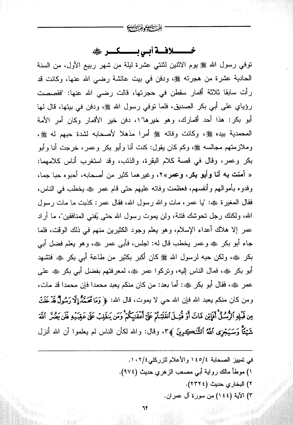 توفي رسول الله - صلى الله عليه وسلم - يوم الاثنين لثنتي عشرة ليلة من شهر ربيع الأول، من السنة الحادية عشرة من هجرته - صلى الله عليه وسلم -، ودفن في بيت عائشة رضي الله عنها، وكانت قد رأت سابقا ثلاثة أقمار سقطن في حجرتها, قالت رضي الله عنها: "فقصصت رؤياي على أبي بكر الصديق، فلما توفي رسول الله - صلى الله عليه وسلم -، ودفن في بيتها، قال لها أبو بكر: هذا أحد أقمارك, وهو خيرها" (¬1)، دفن خير الأقمار وكان أمر الأمة المحمدية بيده - صلى الله عليه وسلم -، وكانت وفاته - صلى الله عليه وسلم - أمرا مذهلا لأصحابه لشدة حبهم له - صلى الله عليه وسلم -، وملازمتهم مجالسه - صلى الله عليه وسلم -، وكم كان يقول: كنت أنا وأبو بكر وعمر، خرجت أنا وأبو بكر وعمر، وقال في قصة كلام البقرة، والذئب، وقد استغرب أناس كلامهما: ... «آمنت به أنا وأبو بكر، وعمر» (¬2)، وغيرهما كثير من أصحابه، أحبوه حبا جما، وفدوه بأموالهم وأنفسهم، فعظمت وفاته عليهم حتى قام عمر - رضي الله عنه - يخطب في الناس، فقال المغيرة - رضي الله عنه -: "يا عمر، مات والله رسول الله، فقال عمر: كذبت ما مات رسول الله، ولكنك رجل تحوشك فتنة، ولن يموت رسول الله حتى يُفني المنافقين"، ما أراد عمر إلا هلاك أعداء الإسلام، وهو يعلم وجود الكثيرين منهم في ذلك الوقت، فلما جاء أبو بكر - رضي الله عنه - وعمر يخطب قال له: اجلس، فأبى عمر - رضي الله عنه -، وهو يعلم فضل أبي بكر - رضي الله عنه -، ولكن حبه لرسول الله - صلى الله عليه وسلم - كان أكبر بكثير من طاعة أبي بكر - رضي الله عنه - فتشهد أبو بكر - رضي الله عنه -، فمال الناس إليه، وتركوا عمر - رضي الله عنه -، لمعرفتهم بفضل أبي بكر - رضي الله عنه - على عمر - رضي الله عنه -، فقال أبو بكر - رضي الله عنه -: أما بعد: من كان منكم يعبد محمدا فإن محمدا قد مات، ومن كان منكم يعبد الله فإن الله حي لا يموت، قال الله: {وَمَا مُحَمَّدٌ إِلَّا رَسُولٌ قَدْ خَلَتْ مِنْ قَبْلِهِ الرُّسُلُ أَفَإِنْ مَاتَ أَوْ قُتِلَ انْقَلَبْتُمْ عَلَى أَعْقَابِكُمْ وَمَنْ يَنْقَلِبْ عَلَى عَقِبَيْهِ فَلَنْ يَضُرَّ اللَّهَ شَيْئًا وَسَيَجْزِي اللَّهُ الشَّاكِرِينَ} (¬3)، وقال: والله لكأن الناس لم يعلموا أن الله أنزل
