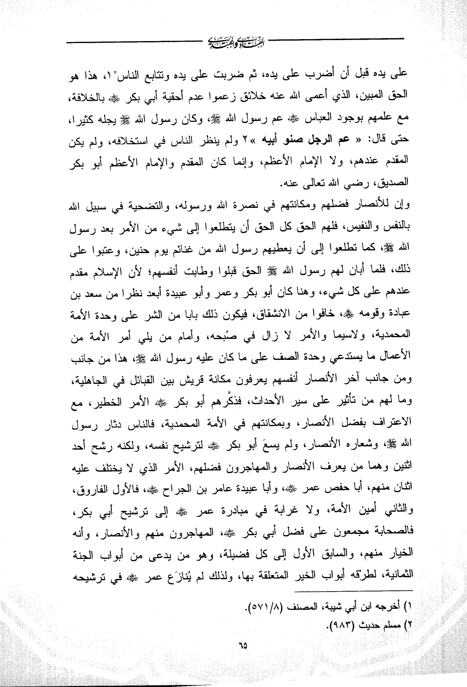 وإن للأنصار فضلهم ومكانتهم في نصرة الله ورسوله، والتضحية في سبيل الله بالنفس والنفيس، فلهم الحق كل الحق أن يتطلعوا إلى شيء من الأمر بعد رسول الله - صلى الله عليه وسلم -، كما تطلعوا إلى أن يعطيهم رسول الله من غنائم يوم حنين، وعتبوا على ذلك، فلما أبان لهم رسول الله - صلى الله عليه وسلم - الحق قبلوا وطابت أنفسهم؛ لأن الإسلام مقدم عندهم على كل شيء، وهنا كان أبو بكر وعمر وأبو عبيدة أبعد نظرا من سعد بن عبادة وقومه - رضي الله عنهم -، خافوا من الانشقاق، فيكون ذلك بابا من الشر على وحدة الأمة المحمدية، ولاسيما والأمر لا زال في صُبحه، وأمام من يلي أمر الأمة من الأعمال ما يستدعي وحدة الصف على ما كان عليه رسول الله - صلى الله عليه وسلم -، هذا من جانب ومن جانب آخر الأنصار أنفسهم يعرفون مكانة قريش بين القبائل في الجاهلية، وما لهم من تأثير على سير الأحداث، فذكَّرهم أبو بكر - رضي الله عنه - الأمر الخطير، مع الاعتراف بفضل الأنصار، وبمكانتهم في الأمة المحمدية، فالناس دثار رسول الله - صلى الله عليه وسلم -، وشعاره الأنصار، ولم يسعَ أبو بكر - رضي الله عنه - لترشيح نفسه، ولكنه رشح أحد اثنين وهما من يعرف الأنصار والمهاجرون فضلهم، الأمر الذي لا يختلف عليه اثنان منهم، أبا حفص عمر - رضي الله عنه -، وأبا عبيدة عامر بن الجراح - رضي الله عنه -، فالأول الفاروق، والثاني أمين الأمة، ولا غرابة في مبادرة عمر - رضي الله عنه - إلى ترشيح أبي بكر، فالصحابة مجمعون على فضل أبي بكر - رضي الله عنه -، المهاجرون منهم والأنصار، وأنه الخيار منهم، والسابق الأول إلى كل فضيلة، وهو من يدعى من أبواب الجنة الثمانية، لطرْقه أبواب الخير المتعلقة بها، ولذلك لم يُنازَع عمر - رضي الله عنه - في ترشيحه