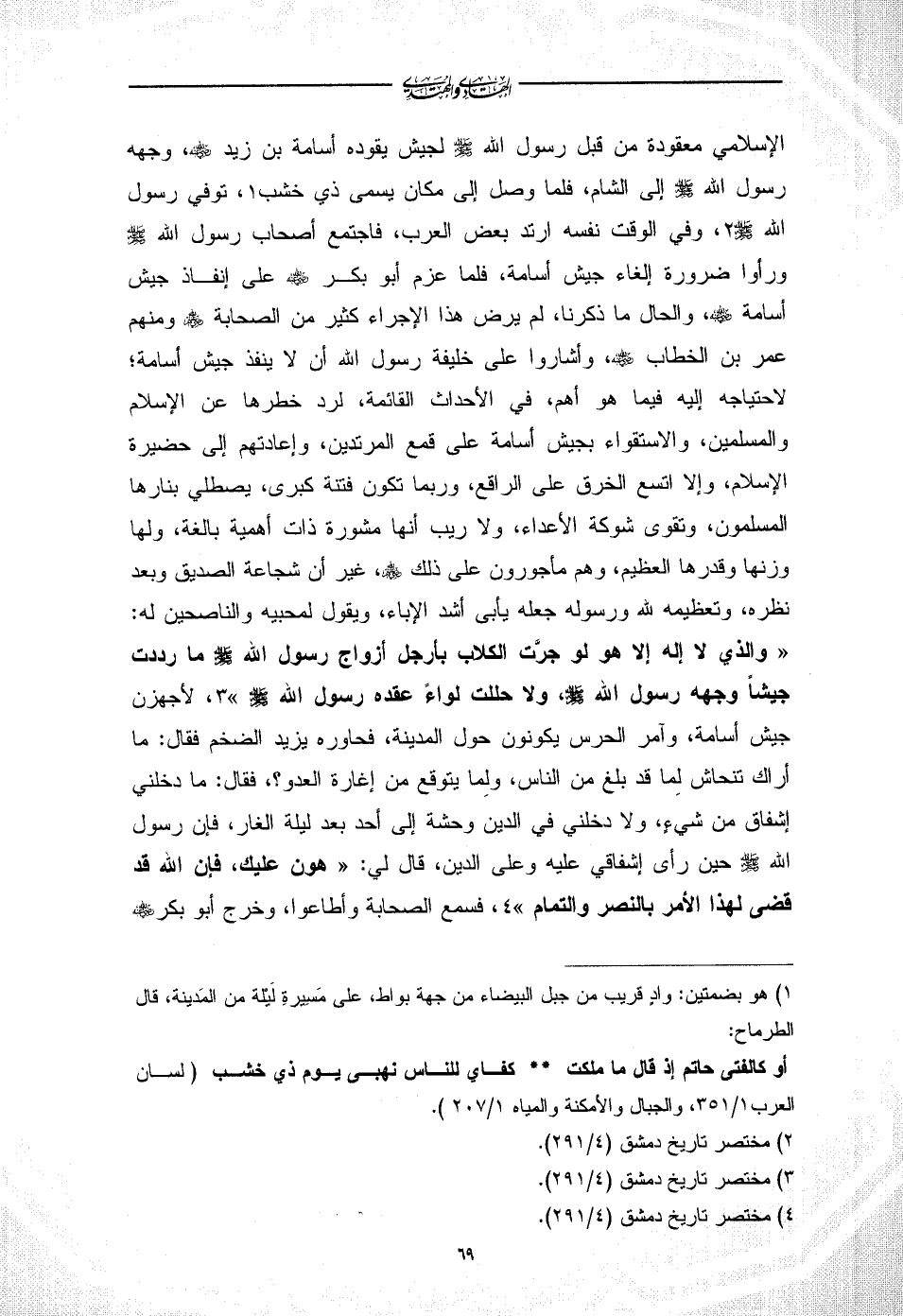 الإسلامي معقودة من قبل رسول الله - صلى الله عليه وسلم - لجيش يقوده أسامة بن زيد - رضي الله عنه -، وجهه رسول الله - صلى الله عليه وسلم - إلى الشام، فلما وصل إلى مكان يسمى ذي خشب (¬1)، توفي رسول الله - صلى الله عليه وسلم - (¬2)، وفي الوقت نفسه ارتد بعض العرب، فاجتمع أصحاب رسول الله - صلى الله عليه وسلم - ورأوا ضرورة إلغاء جيش أسامة، فلما عزم أبو بكر - رضي الله عنه - على إنفاذ جيش أسامة - رضي الله عنه -، والحال ما ذكرنا، لم يرض هذا الإجراء كثير من الصحابة - رضي الله عنهم - ومنهم عمر بن الخطاب - رضي الله عنه -، وأشاروا على خليفة رسول الله أن لا ينفذ جيش أسامة؛ لاحتياجه إليه فيما هو أهم، في الأحداث القائمة، لرد خطرها عن الإسلام والمسلمين، والاستقواء بجيش أسامة على قمع المرتدين، وإعادتهم إلى حضيرة الإسلام، وإلا اتسع الخرق على الراقع، وربما تكون فتنة كبرى، يصطلي بنارها المسلمون، وتقوى شوكة الأعداء، ولا ريب أنها مشورة ذات أهمية بالغة، ولها وزنها وقدرها العظيم، وهم مأجورون على ذلك - رضي الله عنهم -، غير أن شجاعة الصديق وبعد نظره، وتعظيمه لله ورسوله جعله يأبى أشد الإباء، ويقول لمحبيه والناصحين له: «والذي لا إله إلا هو لو جرَّت الكلاب بأرجل أزواج رسول الله - صلى الله عليه وسلم - ما رددت جيشاً وجهه رسول الله - صلى الله عليه وسلم -، ولا حللت لواءً عقده رسول الله - صلى الله عليه وسلم -» (¬3)، لأجهزن جيش أسامة، وآمر الحرس يكونون حول المدينة، فحاوره يزيد الضخم فقال: ما أراك تنحاش لِما قد بلغ من الناس، ولِما يتوقع من إغارة العدو؟ ، فقال: ما دخلني إشفاق من شيءٍ، ولا دخلني في الدين وحشة إلى أحد بعد ليلة الغار، فإن رسول الله - صلى الله عليه وسلم - حين رأى إشفاقي عليه وعلى الدين، قال لي: «هون عليك، فإن الله قد قضى لهذا الأمر بالنصر والتمام» (¬4)، فسمع الصحابة وأطاعوا، وخرج أبو بكر - رضي الله عنه -