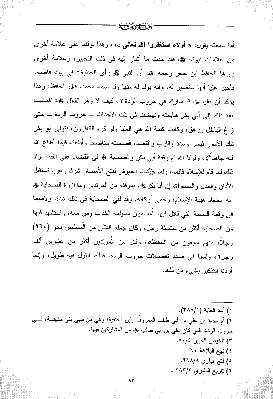 أما سمعته يقول: «أولاء استغفروا الله تعالى» (¬1)، وهذا يوقفنا على علامة أخرى من علامات نبوته - صلى الله عليه وسلم -، فقد حدث ما أشار إليه في ذلك التخيير، وعلامة أخرى رواها الحافظ ابن حجر رحمه الله: أن النبي - صلى الله عليه وسلم - رأى الحنفية (¬2) في بيت فاطمة، فأخبر عليا أنها ستصير له، وأنه يولد له منها ولد اسمه محمد، قال الحافظ: وهذا يؤكد أن عليا - رضي الله عنه - قد شارك في حروب الردة (¬3)، كيف لا وهو القائل - رضي الله عنه -: "فمشيت عند ذلك إلى أبي بكر فبايعته ونهضت في تلك الأحداث - حروب الردة - حتى زاغ الباطل وزهق، وكانت كلمة الله هي العليا ولو كره الكافرون، فتولى أبو بكر تلك الأمور فيسر وسدد وقارب واقتصد، فصحبته مناصحاً وأطعته فيما أطاع الله فيه جاهداً" (¬4)، ولولا الله ثم وقفة أبي بكر والصحابة - رضي الله عنهم - في القضاء على الفتنة لولا ذلك لما قام للإسلام قائمة، ولما جُيِّشت الجيوش لفتح الأمصار شرقا وغربا تستقبل الأذان والعدل والمساواة، إن أبا بكر - رضي الله عنه -، بموقفه من المرتدين ومؤازرة الصحابة - رضي الله عنهم - له استعاد هيبة الإسلام، وحمى أركانه، وقد لقي الصحابة في ذلك شدة، ولاسيما في وقعة اليمامة التي قاتل فيها الْمسلمون مسيلمة الكذاب ومن معه، واستشهد فيها من الصحابة أكثر من ستمائة رجل، وكان جملة القتلى من الْمسلمين نحو (960) رجلاً، منهم سبعون من الحفاظ (¬5)، وقتل من الْمرتدين أكثر من عشرين ألف رجل (¬6)، ولسنا في صدد تفصيلات حروب الردة، فذلك القول فيه طويل، وإنما أردنا التذكير بشيء من ذلك.