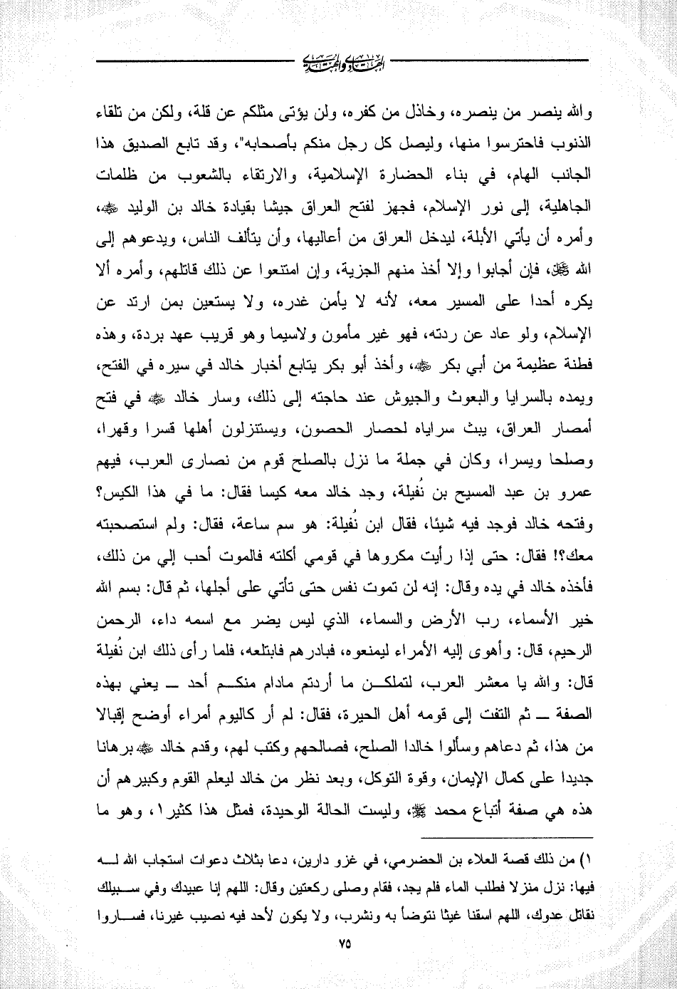 والله ينصر من ينصره، وخاذل من كفره، ولن يؤتى مثلكم عن قلة، ولكن من تلقاء الذنوب فاحترسوا منها، وليصل كل رجل منكم بأصحابه"، وقد تابع الصديق هذا الجانب الهام، في بناء الحضارة الإسلامية، والارتقاء بالشعوب من ظلمات الجاهلية، إلى نور الإسلام، فجهز لفتح العراق جيشا بقيادة خالد بن الوليد - رضي الله عنه -، وأمره أن يأتي الأبلة، ليدخل العراق من أعاليها، وأن يتألف الناس، ويدعوهم إلى الله - عز وجل -، فإن أجابوا وإلا أخذ منهم الجزية، وإن امتنعوا عن ذلك قاتلهم، وأمره ألا يكره أحدا على المسير معه، لأنه لا يأمن غدره، ولا يستعين بمن ارتد عن الإسلام، ولو عاد عن ردته، فهو غير مأمون ولاسيما وهو قريب عهد بردة، وهذه فطنة عظيمة من أبي بكر - رضي الله عنه -، وأخذ أبو بكر يتابع أخبار خالد في سيره في الفتح، ويمده بالسرايا والبعوث والجيوش عند حاجته إلى ذلك، وسار خالد - رضي الله عنه - في فتح أمصار العراق، يبث سراياه لحصار الحصون، ويستنزلون أهلها قسرا وقهرا، وصلحا ويسرا، وكان في جملة ما نزل بالصلح قوم من نصارى العرب، فيهم عمرو بن عبد المسيح بن نُفيلة، وجد خالد معه كيسا فقال: ما في هذا الكيس؟ وفتحه خالد فوجد فيه شيئا، فقال ابن نُفيلة: هو سم ساعة، فقال: ولم استصحبته معك؟ ! فقال: حتى إذا رأيت مكروها في قومي أكلته فالموت أحب إلي من ذلك، فأخذه خالد في يده وقال: إنه لن تموت نفس حتى تأتي على أجلها، ثم قال: بسم الله خير الأسماء، رب الأرض والسماء، الذي ليس يضر مع اسمه داء، الرحمن الرحيم، قال: وأهوى إليه الأمراء ليمنعوه، فبادرهم فابتلعه، فلما رأى ذلك ابن نُفيلة قال: والله يا معشر العرب، لتملكن ما أردتم مادام منكم أحد - يعني بهذه الصفة - ثم التفت إلى قومه أهل الحيرة، فقال: لم أر كاليوم أمراء أوضح إقبالا من هذا، ثم دعاهم وسألوا خالدا الصلح، فصالحهم وكتب لهم، وقدم خالد - رضي الله عنه - برهانا جديدا على كمال الإيمان، وقوة التوكل، وبعد نظر من خالد ليعلم القوم وكبيرهم أن هذه هي صفة أتباع محمد - صلى الله عليه وسلم -، وليست الحالة الوحيدة، فمثل هذا كثير (¬1)،