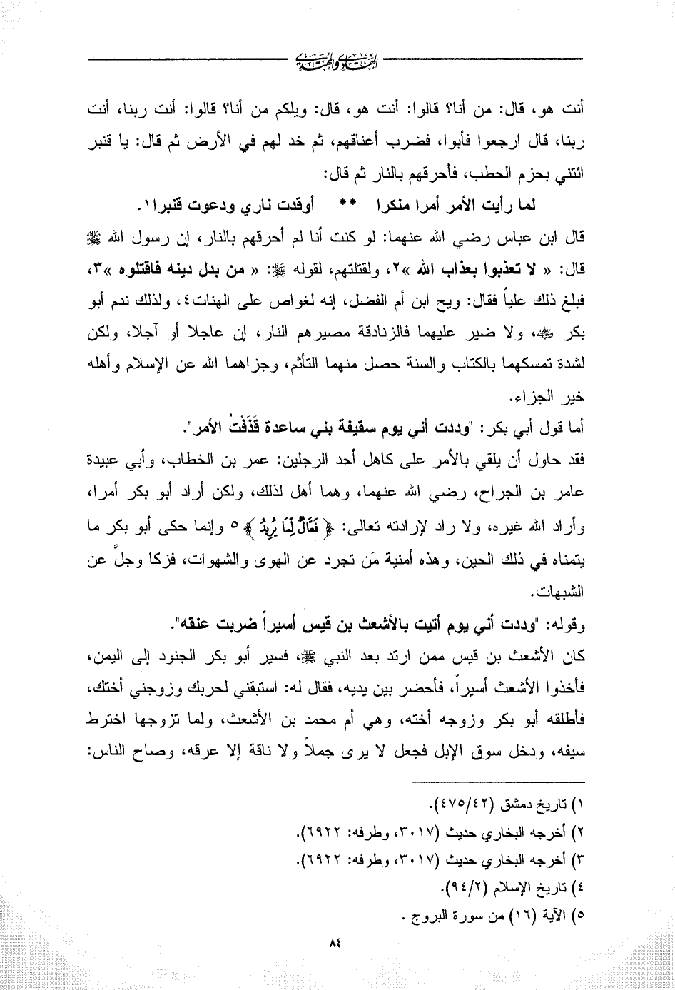 قال ابن عباس رضي الله عنهما: لو كنت أنا لم أحرقهم بالنار، إن رسول الله - صلى الله عليه وسلم - قال: «لا تعذبوا بعذاب الله» (¬2)، ولقتلتهم، لقوله - صلى الله عليه وسلم -: «من بدل دينه فاقتلوه» (¬3)، فبلغ ذلك علياً فقال: ويح ابن أم الفضل، إنه لغواص على الهنات (¬4)، ولذلك ندم أبو بكر - رضي الله عنه -، ولا ضير عليهما فالزنادقة مصيرهم النار، إن عاجلا أو آجلا، ولكن لشدة تمسكهما بالكتاب والسنة حصل منهما التأثم، وجزاهما الله عن الإسلام وأهله خير الجزاء.