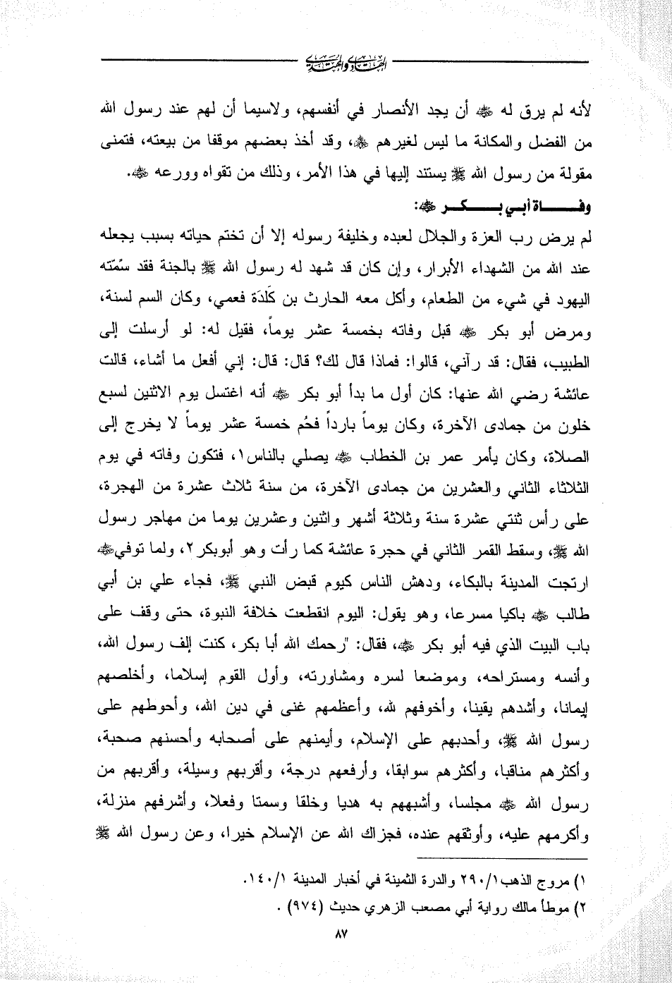 لم يرض رب العزة والجلال لعبده وخليفة رسوله إلا أن تختم حياته بسبب يجعله عند الله من الشهداء الأبرار، وإن كان قد شهد له رسول الله - صلى الله عليه وسلم - بالجنة فقد سمّته اليهود في شيء من الطعام، وأكل معه الحارث بن كَلدَة فعمي، وكان السم لسنة، ومرض أبو بكر - رضي الله عنه - قبل وفاته بخمسة عشر يوماً، فقيل له: لو أرسلت إلى الطبيب، فقال: قد رآني، قالوا: فماذا قال لك؟ قال: قال: إني أفعل ما أشاء، قالت عائشة رضي الله عنها: كان أول ما بدأ أبو بكر - رضي الله عنه - أنه اغتسل يوم الاثنين لسبع خلون من جمادى الآخرة، وكان يوماً بارداً فحُم خمسة عشر يوماً لا يخرج إلى الصلاة، وكان يأمر عمر بن الخطاب - رضي الله عنه - يصلي بالناس (¬1)، فتكون وفاته في يوم الثلاثاء الثاني والعشرين من جمادى الآخرة، من سنة ثلاث عشرة من الهجرة، على رأس ثنتي عشرة سنة وثلاثة أشهر واثنين وعشرين يوما من مهاجر رسول الله - صلى الله عليه وسلم -، وسقط القمر الثاني في حجرة عائشة كما رأت وهو أبوبكر (¬2)، ولما توفي - رضي الله عنه - ارتجت المدينة بالبكاء، ودهش الناس كيوم قبض النبي - صلى الله عليه وسلم -، فجاء علي بن أبي طالب - رضي الله عنه - باكيا مسرعا، وهو يقول: اليوم انقطعت خلافة النبوة، حتى وقف على باب البيت الذي فيه أبو بكر - رضي الله عنه -، فقال: "رحمك الله أبا بكر، كنت إلف رسول الله، وأنسه ومستراحه، وموضعا لسره ومشاورته، وأول القوم إسلاما، وأخلصهم إيمانا، وأشدهم يقينا، وأخوفهم لله، وأعظمهم غنى في دين الله، وأحوطهم على رسول الله - صلى الله عليه وسلم -، وأحدبهم على الإسلام، وأيمنهم على أصحابه وأحسنهم صحبة، وأكثرهم مناقبا، وأكثرهم سوابقا، وأرفعهم درجة، وأقربهم وسيلة، وأقربهم من رسول الله - رضي الله عنه - مجلسا، وأشبههم به هديا وخلقا وسمتا وفعلا، وأشرفهم منزلة، وأكرمهم عليه، وأوثقهم عنده، فجزاك الله عن الإسلام خيرا، وعن رسول الله - صلى الله عليه وسلم -