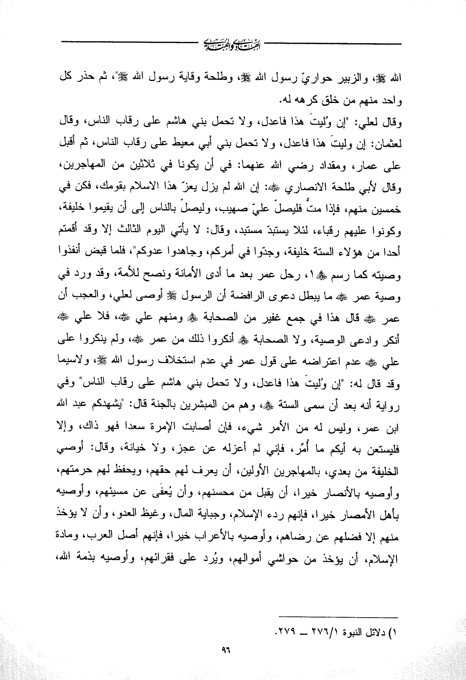 وقال لعلي: "إن وُليتَ هذا فاعدل، ولا تحمل بني هاشم على رقاب الناس، وقال لعثمان: إن وليتَ هذا فاعدل، ولا تحمل بني أبي معيط على رقاب الناس، ثم أقبل على عمار، ومقداد رضي الله عنهما: في أن يكونا في ثلاثين من المهاجرين، وقال لأبي طلحة الانصاري - رضي الله عنه -: إن الله لم يزل يعزّ هذا الاسلام بقومك، فكن في خمسين منهم، فإذا متُّ فليصلّ عليّ صهيب، وليصلّ بالناس إلى أن يقيموا خليفة، وكونوا عليهم رقباء، لئلا يستبدّ مستبد، وقال: لا يأتي اليوم الثالث إلا وقد أقمتم أحدا من هؤلاء الستة خليفة، وجدّوا في أمركم، وجاهدوا عدوكم"، فلما قبض أنفذوا وصيته كما رسم - رضي الله عنهم - (¬1)، رحل عمر بعد ما أدى الأمانة ونصح للأمة، وقد ورد في وصية عمر - رضي الله عنه - ما يبطل دعوى الرافضة أن الرسول - صلى الله عليه وسلم - أوصى لعلي، والعجب أن عمر - رضي الله عنه - قال هذا في جمع غفير من الصحابة - رضي الله عنهم - ومنهم علي - رضي الله عنه -، فلا علي - رضي الله عنه - أنكر وادعى الوصية، ولا الصحابة - رضي الله عنهم - أنكروا ذلك من عمر - رضي الله عنه -، ولم ينكروا على علي - رضي الله عنه - عدم اعتراضه على قول عمر في عدم استخلاف رسول الله - صلى الله عليه وسلم -، ولاسيما وقد قال له: "إن وُليتَ هذا فاعدل، ولا تحمل بني هاشم على رقاب الناس" وفي رواية أنه بعد أن سمى الستة - رضي الله عنهم -، وهم من المبشرين بالجنة قال: "يشهدكم عبد الله ابن عمر، وليس له من الأمر شيء، فإن أصابت الإمرة سعدا فهو ذاك، وإلا فليستعن به أيكم ما أُمِّر، فإني لم أعزله عن عجز، ولا خيانة، وقال: أوصي الخليفة من بعدي، بالمهاجرين الأولين، أن يعرف لهم حقهم، ويحفظ لهم حرمتهم، وأوصيه بالأنصار خيرا، أن يقبل من محسنهم، وأن يُعفَى عن مسيئهم، وأوصيه بأهل الأمصار خيرا، فإنهم ردء الإسلام، وجباية المال، وغيظ العدو، وأن لا يؤخذ منهم إلا فضلهم عن رضاهم، وأوصيه بالأعراب خيرا، فإنهم أصل العرب، ومادة الإسلام، أن يؤخذ من حواشي أموالهم، ويُرد على فقرائهم، وأوصيه بذمة الله،