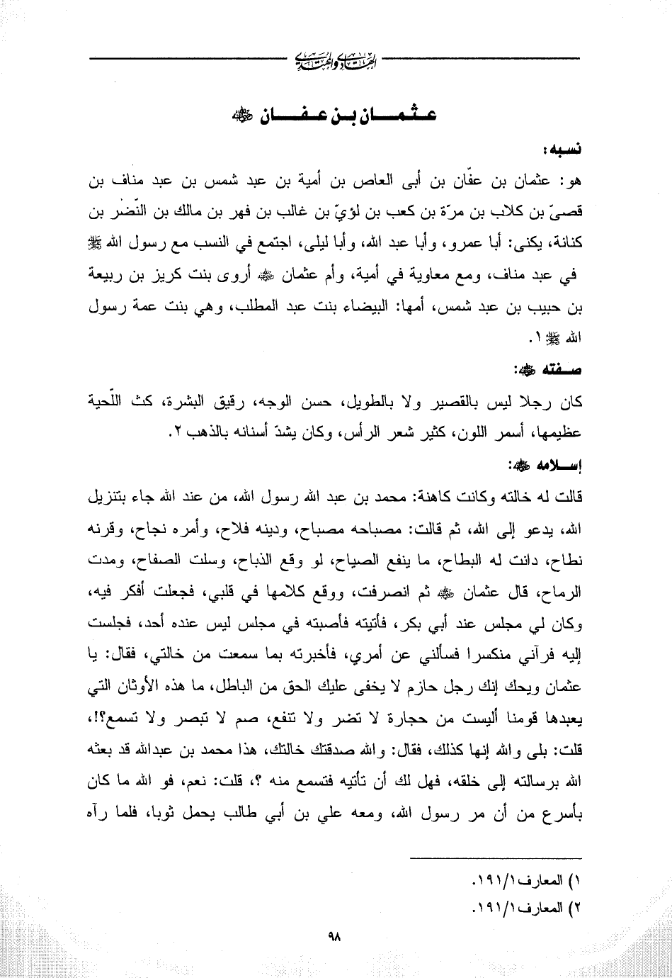هو: عثمان بن عفّان بن أبى العاص بن أمية بن عبد شمس بن عبد مناف بن قصىّ بن كلاب بن مرّة بن كعب بن لؤيّ بن غالب بن فهر بن مالك بن النّضر بن كنانة، يكنى: أبا عمرو، وأبا عبد الله، وأبا ليلى، اجتمع في النسب مع رسول الله - صلى الله عليه وسلم - في عبد مناف، ومع معاوية في أمية، وأم عثمان - رضي الله عنه - أروى بنت كريز بن ربيعة بن حبيب بن عبد شمس، أمها: البيضاء بنت عبد المطلب، وهي بنت عمة رسول الله - صلى الله عليه وسلم - (¬1).