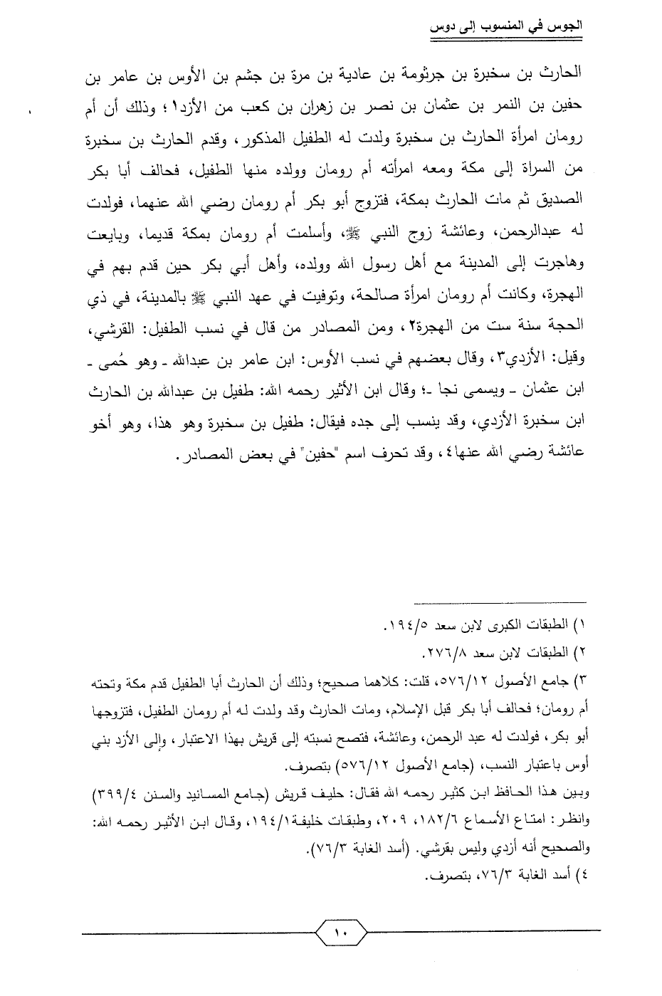 (¬3) جامع الأصول 12/ 576، قلت: كلاهما صحيح؛ وذلك أن الحارث أبا الطفيل قدم مكة وتحته أم رومان؛ فحالف أبا بكر قبل الإسلام، ومات الحارث وقد ولدت له أم رومان الطفيل، فتزوجها أبو بكر، فولدت له عبد الرحمن، وعائشة، فتصح نسبته إلى قريش بهذا الاعتبار، وإلى الأزد بني أوس باعتبار النسب، (جامع الأصول 12/ 576) بتصرف.
