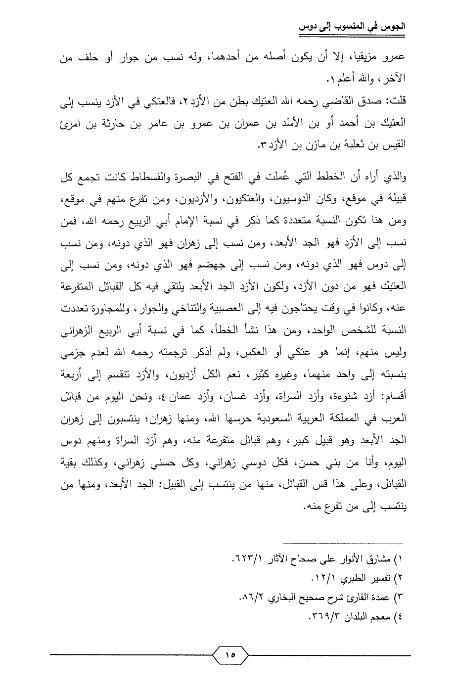 والذي أراه أن الخطط التي عُملت في الفتح في البصرة والفسطاط كانت تجمع كل قبيلة في موقع، وكان الدوسيون، والعتكيون، والأزديون، ومن تفرع منهم في موقع، ومن هنا تكون النسبة متعددة كما ذكر في نسبة الإمام أبي الربيع رحمه الله، فمن نسب إلى الأزد فهو الجد الأبعد، ومن نسب إلى زهران فهو الذي دونه، ومن نسب إلى دوس فهو الذي دونه، ومن نسب إلى جهضم فهو الذي دونه، ومن نسب إلى العتيك فهو من دون الأزد، ولكون الأزد الجد الأبعد يلتقي فيه كل القبائل المتفرعة عنه، وكانوا في وقت يحتاجون فيه إلى العصبية والتناخي والجوار، وللمجاورة تعددت النسبة للشخص الواحد، ومن هذا نشأ الخطأ، كما في نسبة أبي الربيع الزهراني وليس منهم، إنما هو عتكي أو العكس، ولم أذكر ترجمته رحمه الله لعدم جزمي بنسبته إلى واحد منهما، وغيره كثير، نعم الكل أزديون، والأزد تنقسم إلى أربعة أقسام: أزد شنوءة، وأزد السراة، وأزد غسان، وأزد عمان (¬4)، ونحن اليوم من قبائل العرب في المملكة العربية السعودية حرسها الله، ومنها زهران؛ ينتسبون إلى زهران الجد الأبعد وهو قبيل كبير، وهم قبائل متفرعة منه، وهم أزد السراة ومنهم دوس اليوم، وأنا من بني حسن، فكل دوسي زهراني، وكل حسني زهراني، وكذلك بقية القبائل، وعلى هذا قس القبائل، منها من ينتسب إلى القبيل: الجد الأبعد، ومنها من ينتسب إلى من تفرع منه.