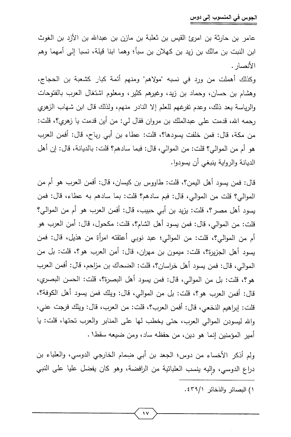 ولم أذكر الأخساء من دوس؛ الجعد بن أبي ضِمام الخارجي الدوسي، والعلباء بن دراع الدوسي، وإليه ينسب العلبائية من الرافضة، وهو كان يفضل عليا على النبي