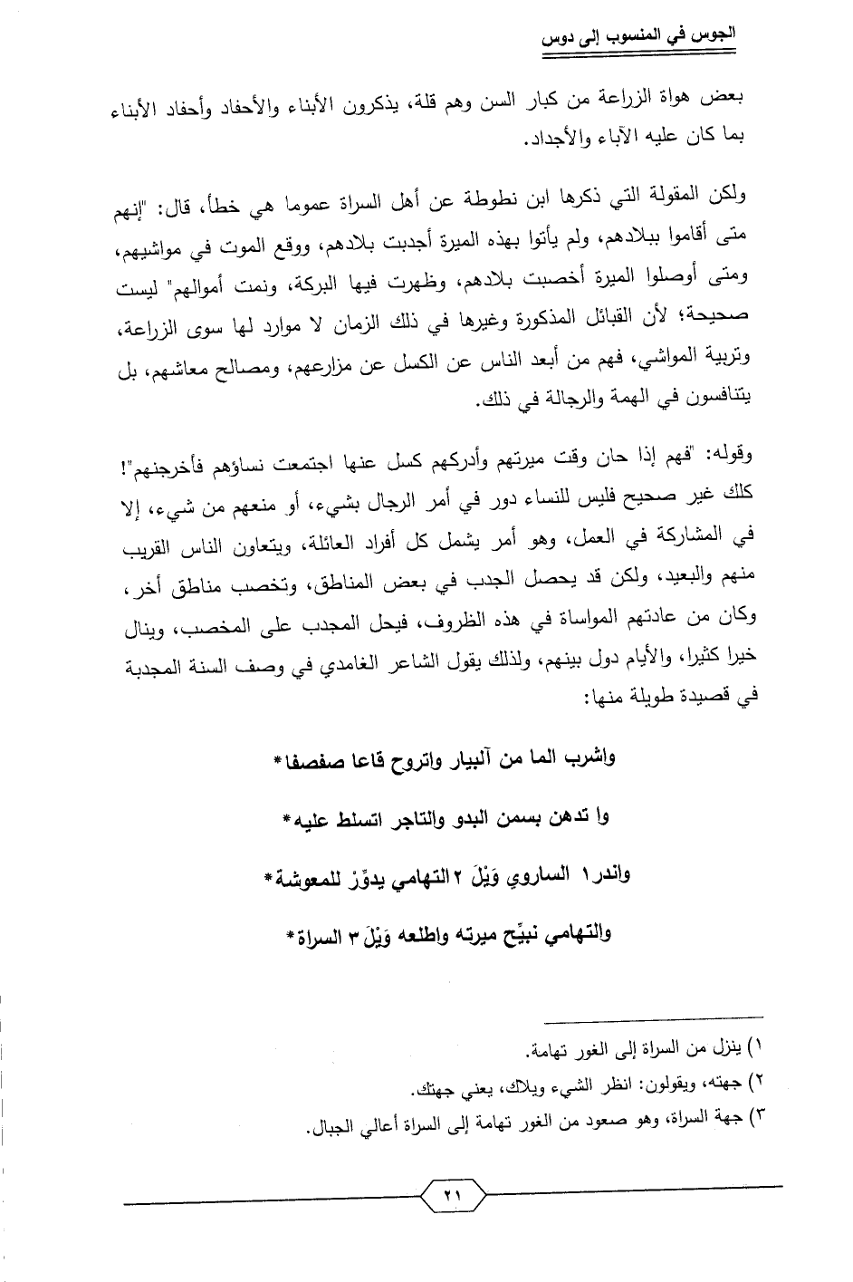وقوله: "فهم إذا حان وقت ميرتهم وأدركهم كسل عنها اجتمعت نساؤهم فأخرجنهم"! كلك غير صحيح فليس للنساء دور في أمر الرجال بشيء، أو منعهم من شيء، إلا في المشاركة في العمل، وهو أمر يشمل كل أفراد العائلة، ويتعاون الناس القريب منهم والبعيد، ولكن قد يحصل الجدب في بعض المناطق، وتخصب مناطق أخر، وكان من عادتهم المواساة في هذه الظروف، فيحل المجدب على المخصب، وينال خيرا كثيرا، والأيام دول بينهم، ولذلك يقول الشاعر الغامدي في وصف السنة المجدبة في قصيدة طويلة منها: