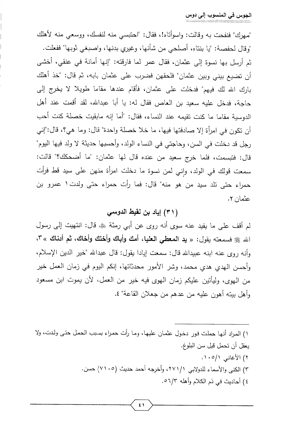 ثم أرسل بها نسوة إلى عثمان، فقال عمر لما فارقته: "إنها أمانة في عنقي، أخشى أن تضيع بيني وبين عثمان" فلحقهن فضرب على عثمان بابه، ثم قال: "خذ أهلك بارك الله لك فيهم" فدخلت على عثمان، فأقام عندها مقاما طويلا لا يخرج إلى حاجة، فدخل عليه سعيد بن العاص فقال له: يا أبا عبدالله، لقد أقمت عند أهل الدوسية مقاما ما كنت تقيمه عند النساء، فقال: "أما إنه مابقيت خصلة كنت أحب أن تكون في امرأة إلا صادفتها فيها، ما خلا خصلة واحجة" قال: وما هي؟ ، قال: "إني رجل قد دخلت في السن، وحاجتي في النساء الولد، وأحسبها حديثة لا ولد فيها اليوم" قال: فتبسمت، فلما خرج سعيد من عنده قال لها عثمان: "ما أضحكك؟ " قالت: سمعت قولك في الولد، وإني لمن نسوة ما دخلت امرأة منهن علي سيد قط فرأت حمراء حتى تلد سيد من هو منه" قال: فما رأت حمراء حتى ولدت (¬1) عمرو بن عثمان (¬2).