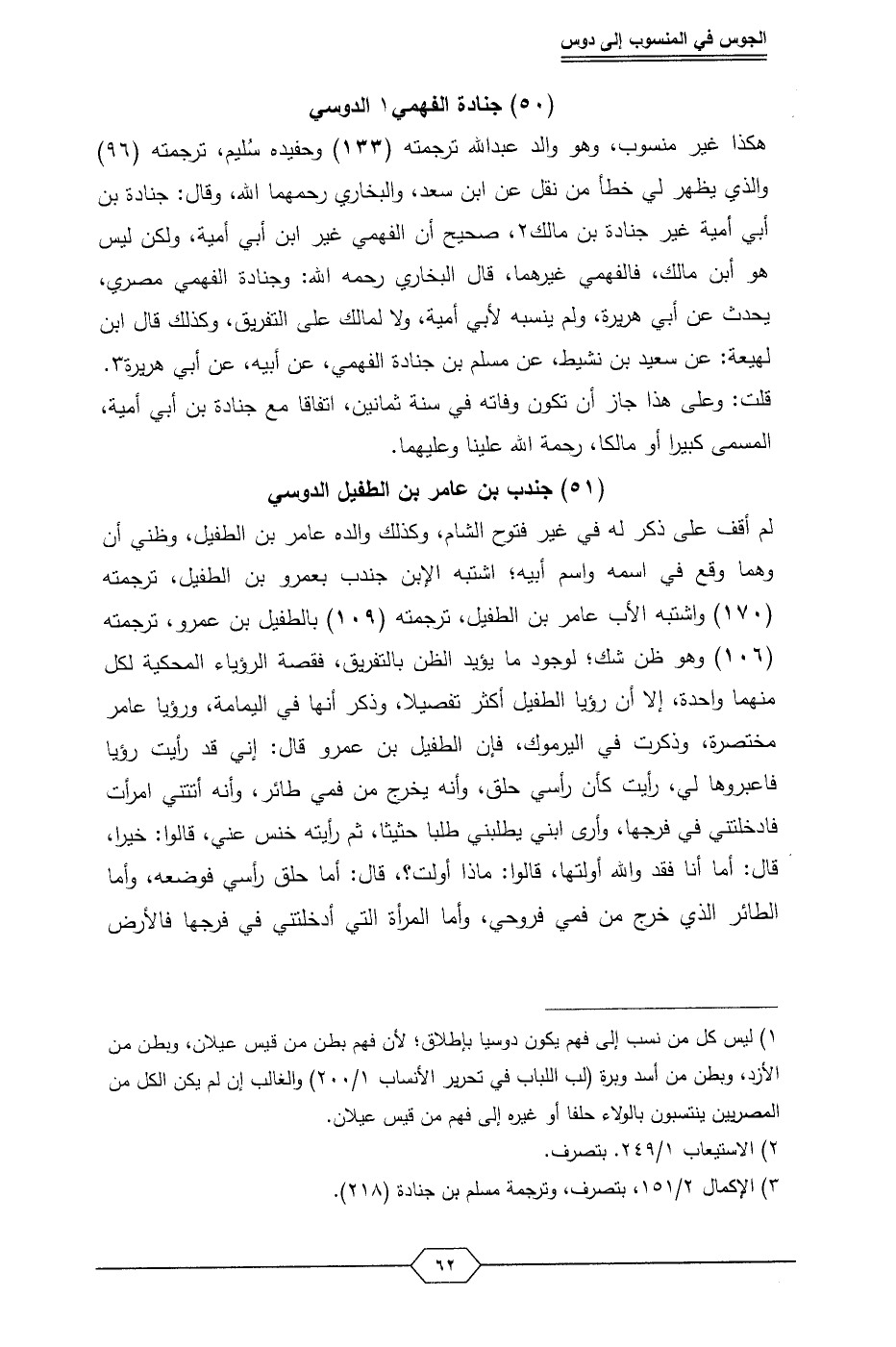 (¬1) ليس كل من نسب إلى فهم يكون دوسيا بإطلاق؛ لأن فهم بطن من قيس عيلان، وبطن من الأزد، وبطن من أسد وبرة (لب اللباب في تحرير الأنساب 1/ 200) والغالب إن لم يكن الكل من المصريين ينتسبون بالولاء حلفا أو غيره إلى فهم من قيس عيلان.
