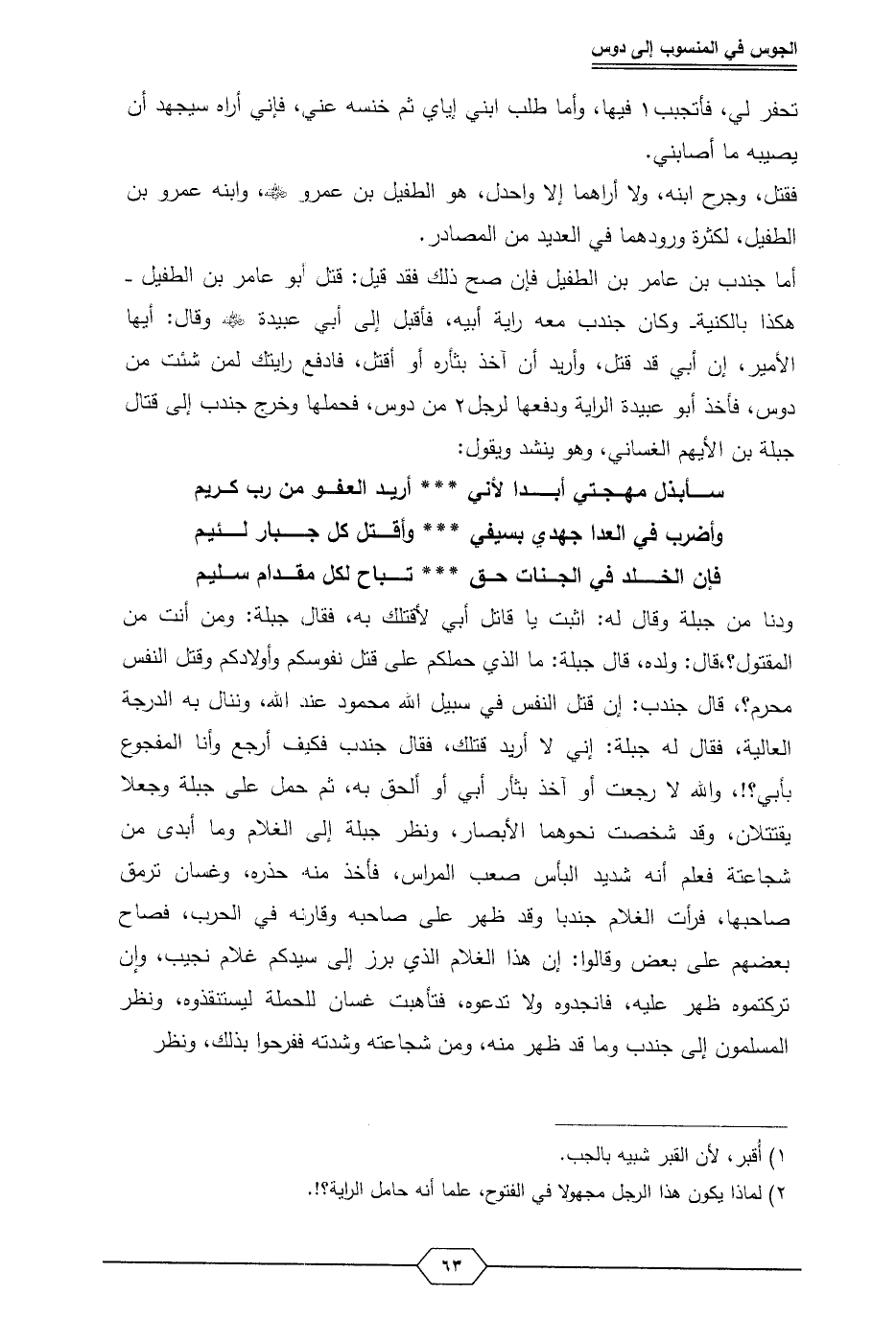 أما جندب بن عامر بن الطفيل فإن صح ذلك فقد قيل: قتل أبو عامر بن الطفيل ـــ هكذا بالكنيةـ وكان جندب معه راية أبيه، فأقبل إلى أبي عبيد - رضي الله عنه - وقال: أيها الأمير، إن أبي قد قتل، وأريد أن آخذ بثأره أو أقتل، فادفع رايتك لمن شئت من دوس، فأخذ أبو عبيدة الراية ودفعها لرجل (¬2) من دوس، فحملها وخرج جندب إلى قتال جبلة بن الأيهم الغساني، وهو ينشد ويقول: