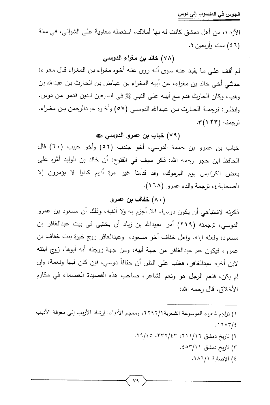 خباب بن عمرو بن حممة الدوسي، أخو جندب (52) وأخو حبيب (60) قال الحافظ ابن حجر رحمه الله: ذكر سيف في الفتوح: أن خالد بن الوليد أمَّره على بعض الكراديس يوم اليرموك، وقد قمدمنا غير مرة أنهم كانوا لا يؤمرون إلا الصحابة (¬4)، ترجمة والده عمرو (168).