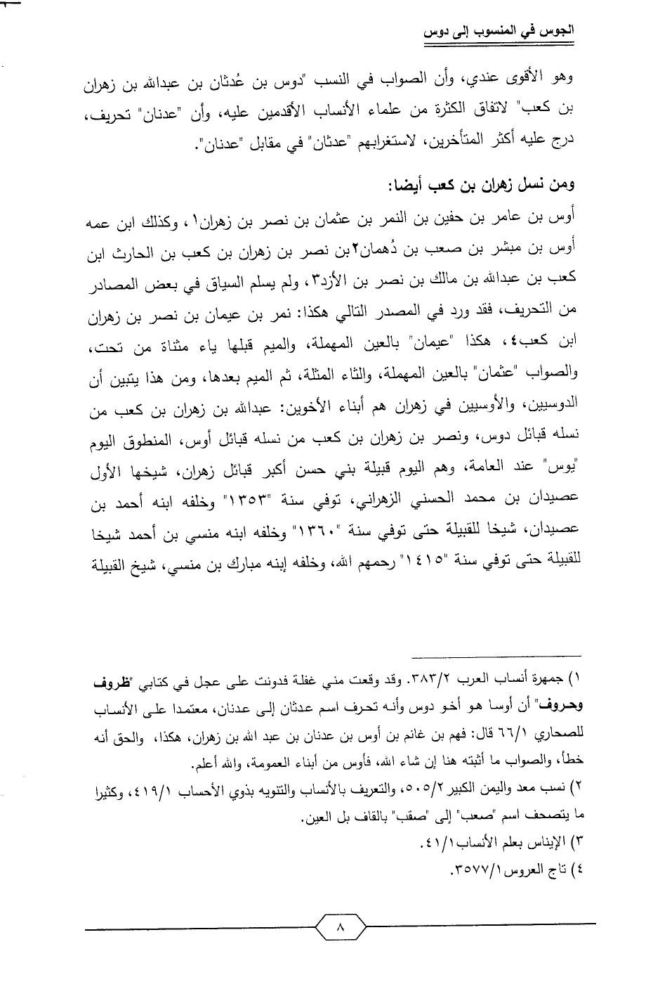 وهو الأقوى عندي، وأن الصواب في النسب "دوس بن عُدثان بن عبدالله بن زهران بن كعب" لاتفاق الكثرة من علماء الأنساب الأقدمين عليه، وأن "عدنان" تحريف، درج عليه أكثر المتأخرين، لاستغرابهم "عدثان" في مقابل "عدنان".
