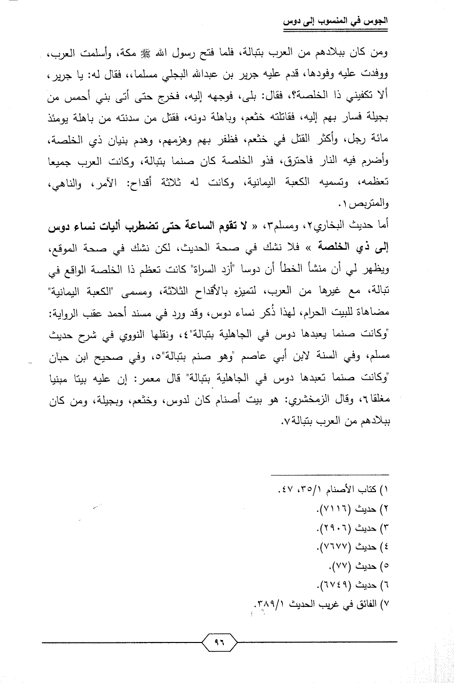 أما حديث البخاري (¬2)، ومسلم (¬3)، «لا تقوم الساعة حتى تضطرب أليات نساء دوس إلى ذي الخلصة» فلا نشك في صحة الحديث، لكن نشك في صحة الموقع، ويظهر لي أن منشأ الخطأ أن دوسا "أزد السراة" كانت تعظم ذا الخلصة الواقع في تبالة، مع غيرها من العرب، لتميزه بالأقداح الثلاثة، ومسمى "الكعبة اليمانية" مضاهات للبيت الحرام، لهذا ذُكر نساء دوس، وقد ورد في مسند أحمد عقب الرواية: "وكانت صنما يعبدها دوس في الجاهلية بتبالة" (¬4)، ونقلها النووي في شرح حديث مسلم، وفي السنة لابن أبي عاصم "وهو صنم بتبالة" (¬5)، وفي صحيح ابن حبان "وكانت صنما تعبدها دوس في الجاهلية بتبالة" قال معمر: إن عليه بيتا مبنيا مغلقا (¬6)، وقال الزمخشري: هو بيت أصنام كان لدوس، وخثعم، وبجيلة، ومن كان ببلادهم من العرب بتبالة (¬7).