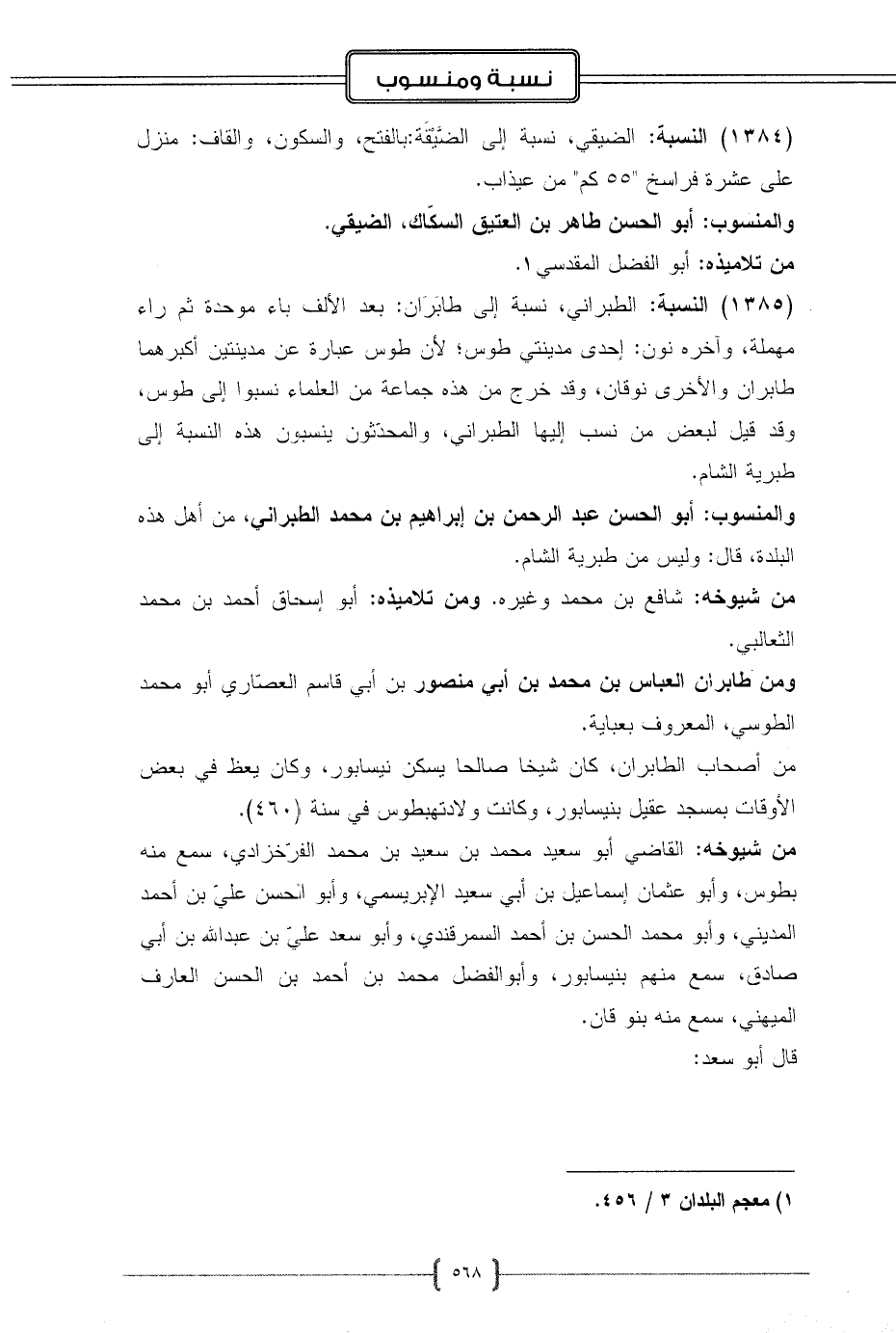 (1385) النسبة: الطبراني، نسبة إلى طابَرَان: بعد الألف باء موحدة ثم راء مهملة، وآخره نون: إحدى مدينتي طوس؛ لأن طوس عبارة عن مدينتين أكبرهما طابران والأخرى نوقان، وقد خرج من هذه جماعة من العلماء نسبوا إلى طوس، وقد قيل لبعض من نسب إليها الطبراني، والمحدّثون ينسبون هذه النسبة إلى طبرية الشام.