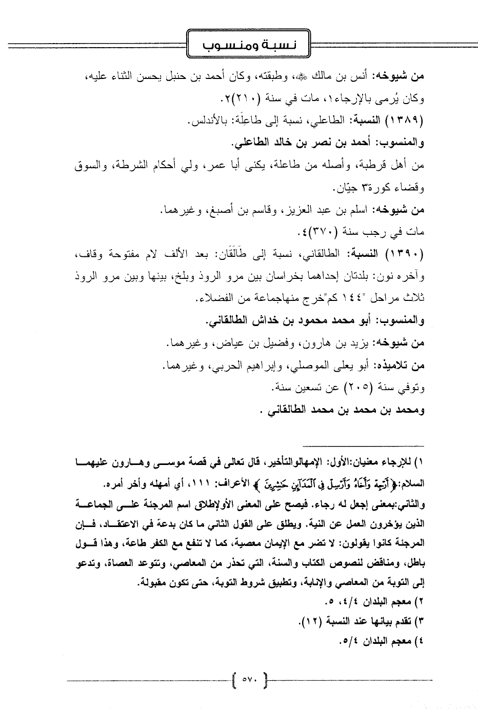 (1390) النسبة: الطالقاني، نسبة إلى طَالَقَان: بعد الألف لام مفتوحة وقاف، وآخره نون: بلدتان إحداهما بخراسان بين مرو الروذ وبلخ، بينها وبين مرو الروذ ثلاث مراحل "144 كم" خرج منها جماعة من الفضلاء.