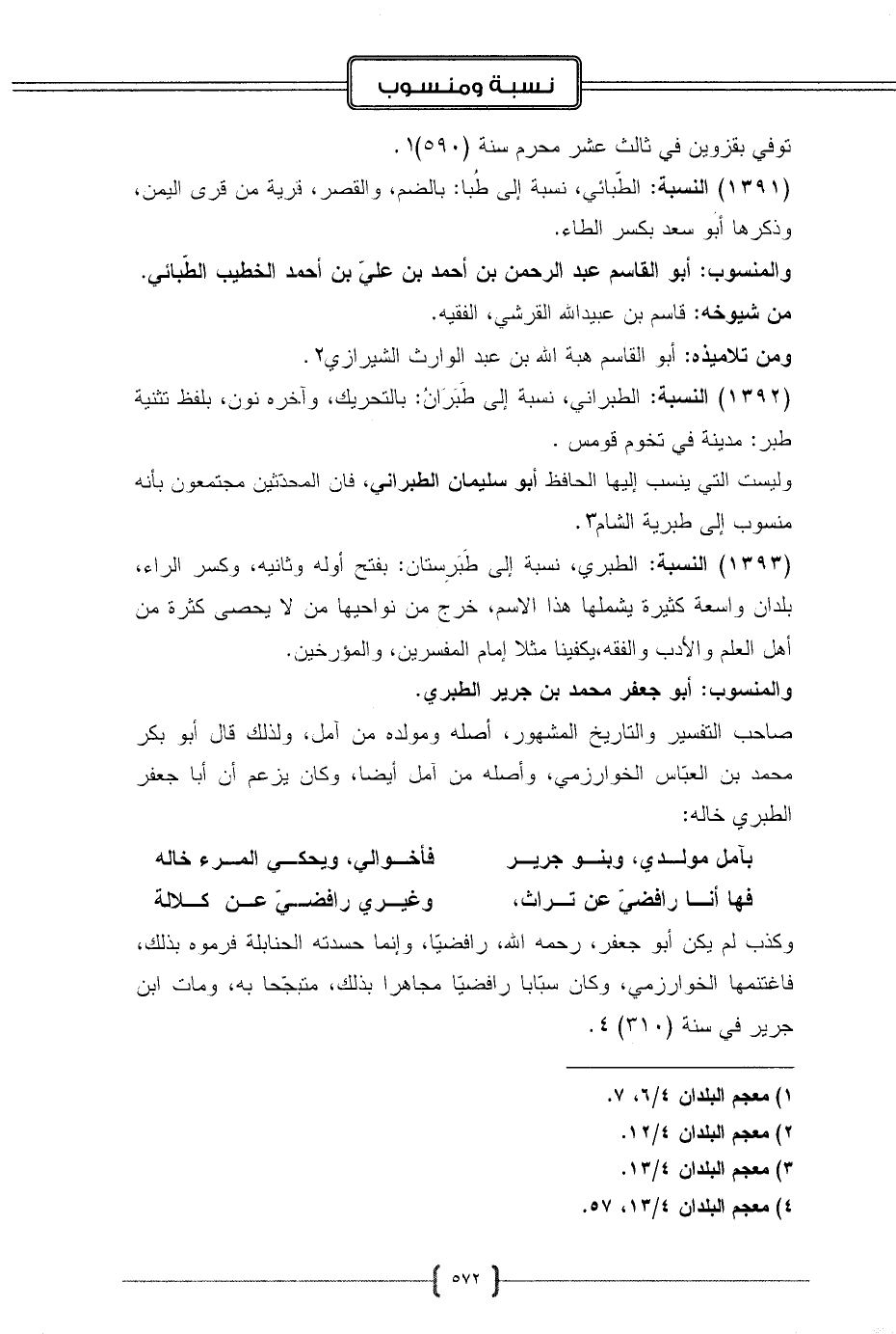 (1393) النسبة: الطبري، نسبة إلى طَبَرِستان: بفتح أوله وثانيه، وكسر الراء، بلدان واسعة كثيرة يشملها هذا الاسم، خرج من نواحيها من لا يحصى كثرة من أهل العلم والأدب والفقه، يكفينا مثلا إمام المفسرين، والمؤرخين.
