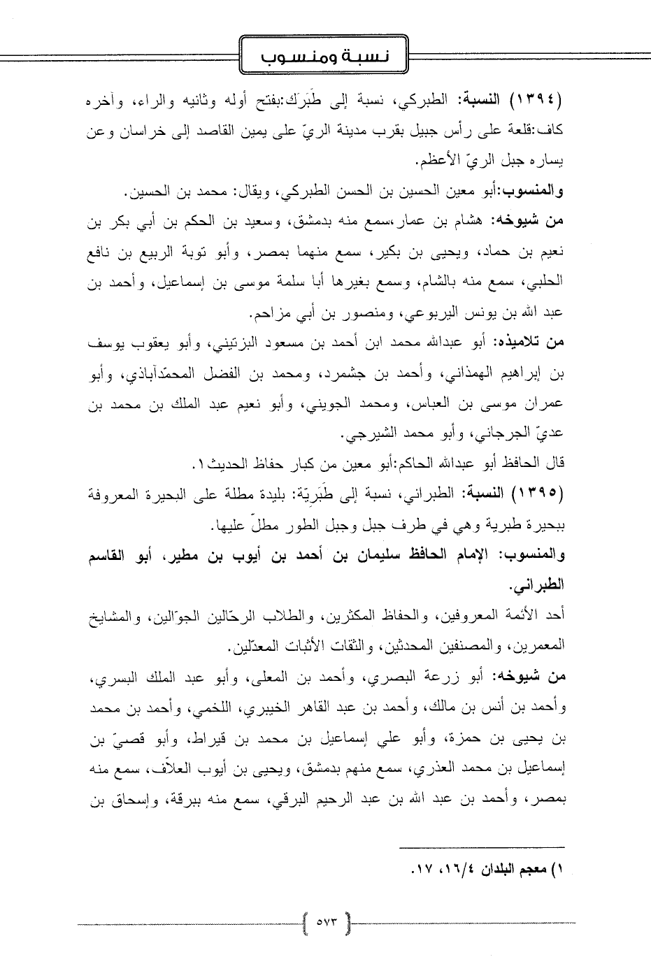 (1395) النسبة: الطبراني، نسبة إلى طَبَرِيّة: بليدة مطلة على البحيرة المعروفة ببحيرة طبرية وهي في طرف جبل وجبل الطور مطلّ عليها.