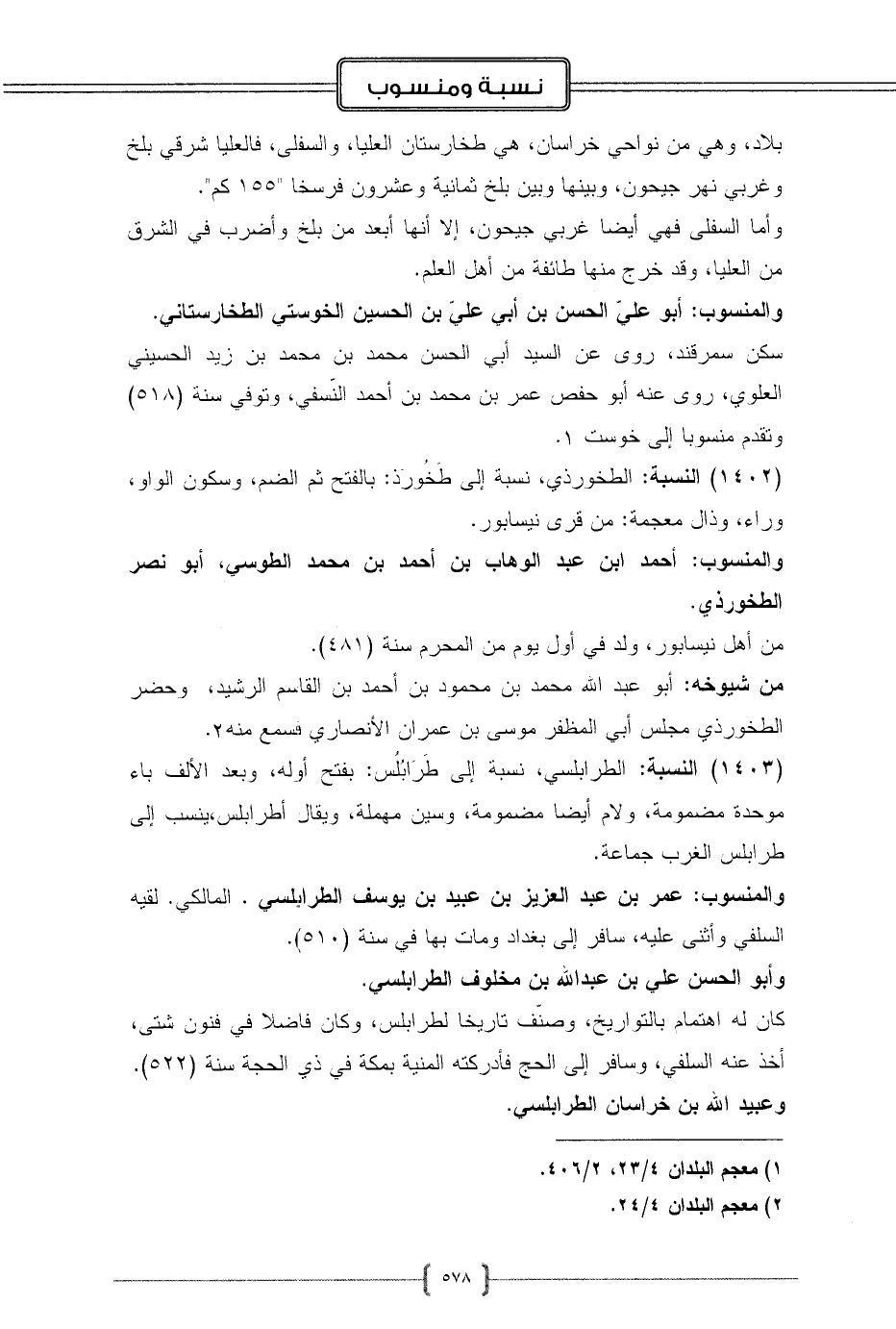 (1403) النسبة: الطرابلسي، نسبة إلى طَرَابُلُس: بفتح أوله، وبعد الألف باء موحدة مضمومة، ولام أيضا مضمومة، وسين مهملة، ويقال أطرابلس، ينسب إلى طرابلس الغرب جماعة.