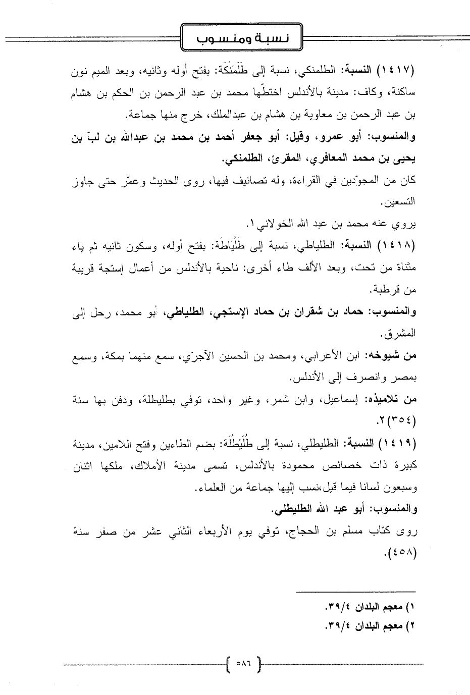 (1417) النسبة: الطلمنكي، نسبة إلى طَلَمَنْكَة: بفتح أوله وثانيه، وبعد الميم نون ساكنة، وكاف: مدينة بالأندلس اختطّها محمد بن عبد الرحمن بن الحكم بن هشام بن عبد الرحمن بن معاوية بن هشام بن عبدالملك، خرج منها جماعة.