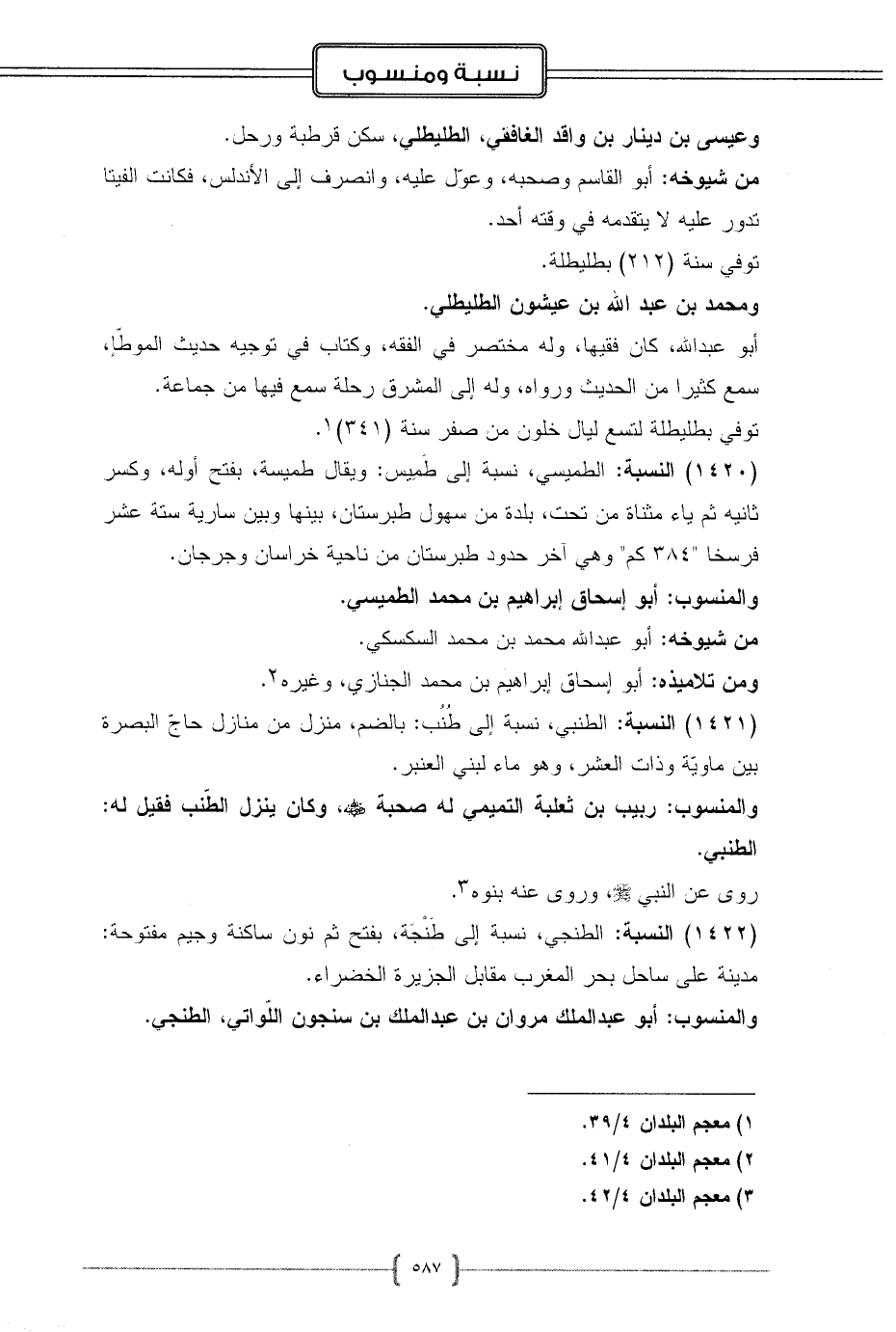 (1420) النسبة: الطميسي، نسبة إلى طَمِيس: ويقال طميسة، بفتح أوله، وكسر ثانيه ثم ياء مثناة من تحت، بلدة من سهول طبرستان، بينها وبين سارية ستة عشر فرسخا "384 كم" وهي آخر حدود طبرستان من ناحية خراسان وجرجان.