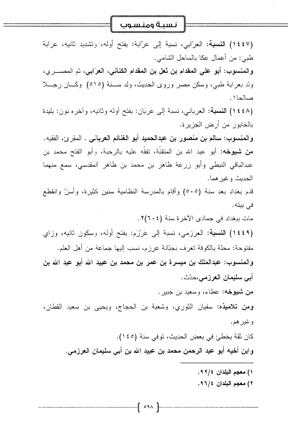 (1449) النسبة: العرزمي، نسبة إلى عَرْزَم: بفتح أوله، وسكون ثانيه، وزاي مفتوحة: محلة بالكوفة تعرف بجبّانة عرزم، نسب إليها جماعة من أهل العلم.