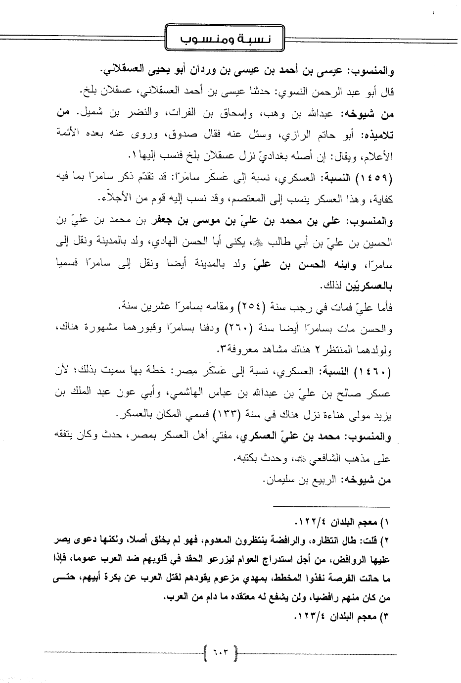 (1459) النسبة: العسكري، نسبة إلى عَسكَر سامَرّا: قد تقدّم ذكر سامرّا بما فيه كفاية، وهذا العسكر ينسب إلى المعتصم، وقد نسب إليه قوم من الأجلّاء.