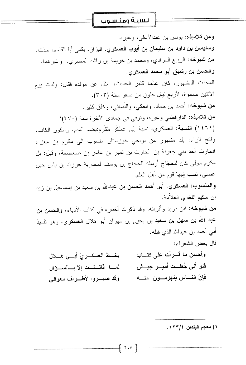 (1461) النسبة: العسكري، نسبة إلى عَسْكَر مُكْرَم: بضم الميم، وسكون الكاف، وفتح الراء: بلد مشهور من نواحي خوزستان منسوب الى مكرم بن معزاء الحارث أحد بني جعونة بن الحارث بن نمير بن عامر بن صعصعة، وقيل: بل مكرم مولى كان للحجّاج أرسله الحجاج بن يوسف لمحاربة خرزاد بن باس حين عصى، نسب إليها قوم من أهل العلم.