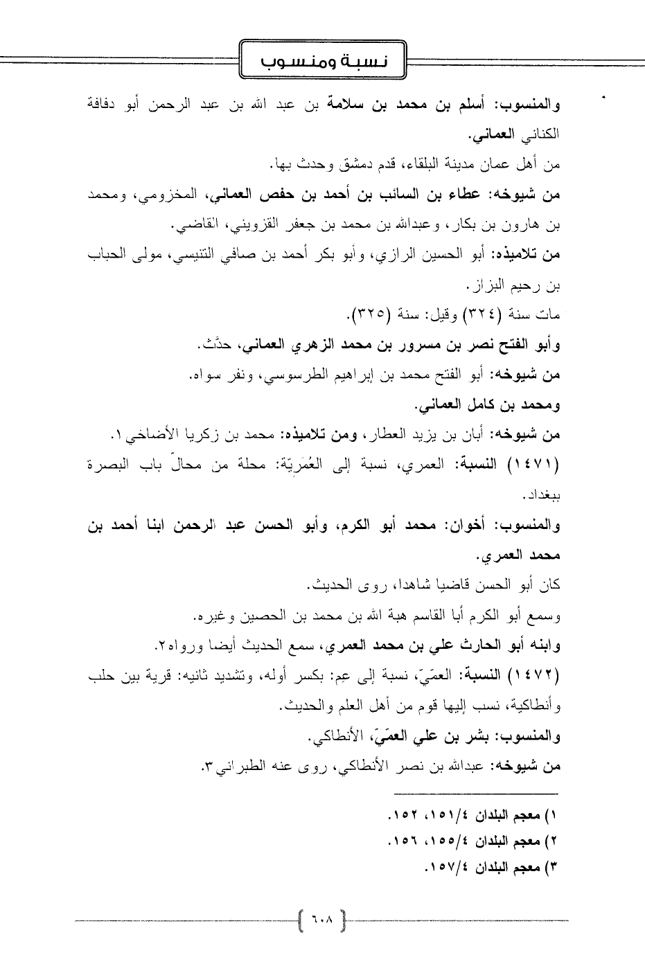 (1472) النسبة: العمّيّ، نسبة إلى عِم: بكسر أوله، وتشديد ثانيه: قرية بين حلب وأنطاكية، نسب إليها قوم من أهل العلم والحديث.