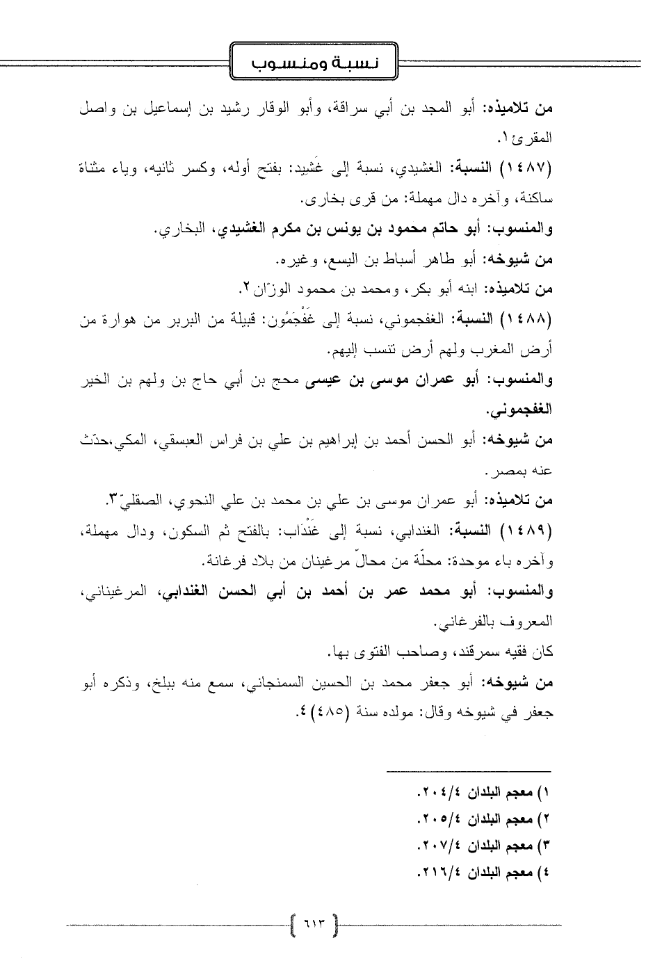 (1489) النسبة: الغندابي، نسبة إلى غَنْدَاب: بالفتح ثم السكون، ودال مهملة، وآخره باء موحدة: محلّة من محالّ مرغينان من بلاد فرغانة.