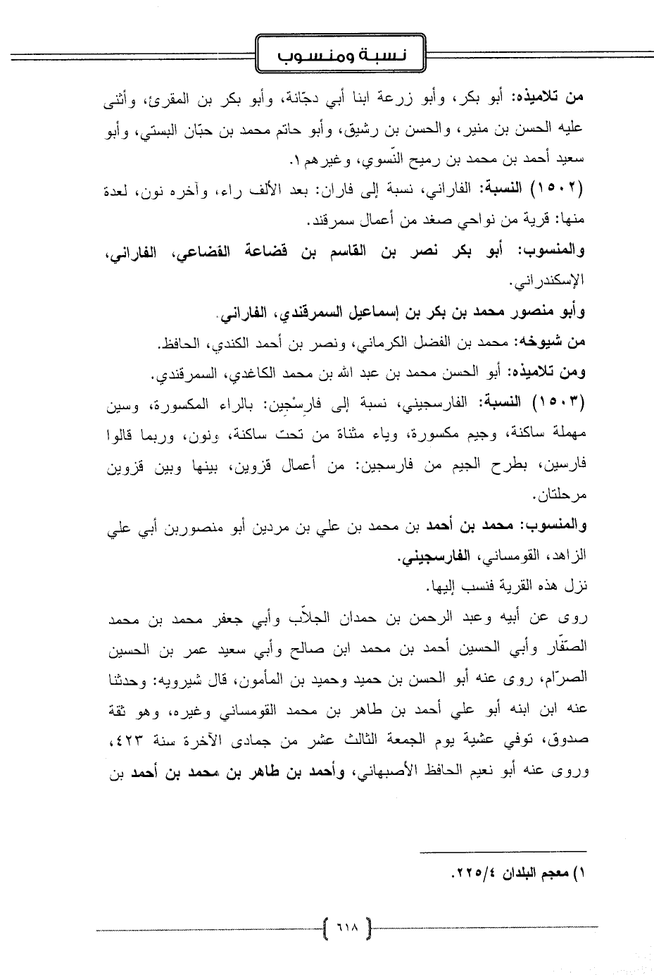 (1502) النسبة: الفاراني، نسبة إلى فاران: بعد الألف راء، وآخره نون، لعدة منها: قرية من نواحي صغد من أعمال سمرقند.