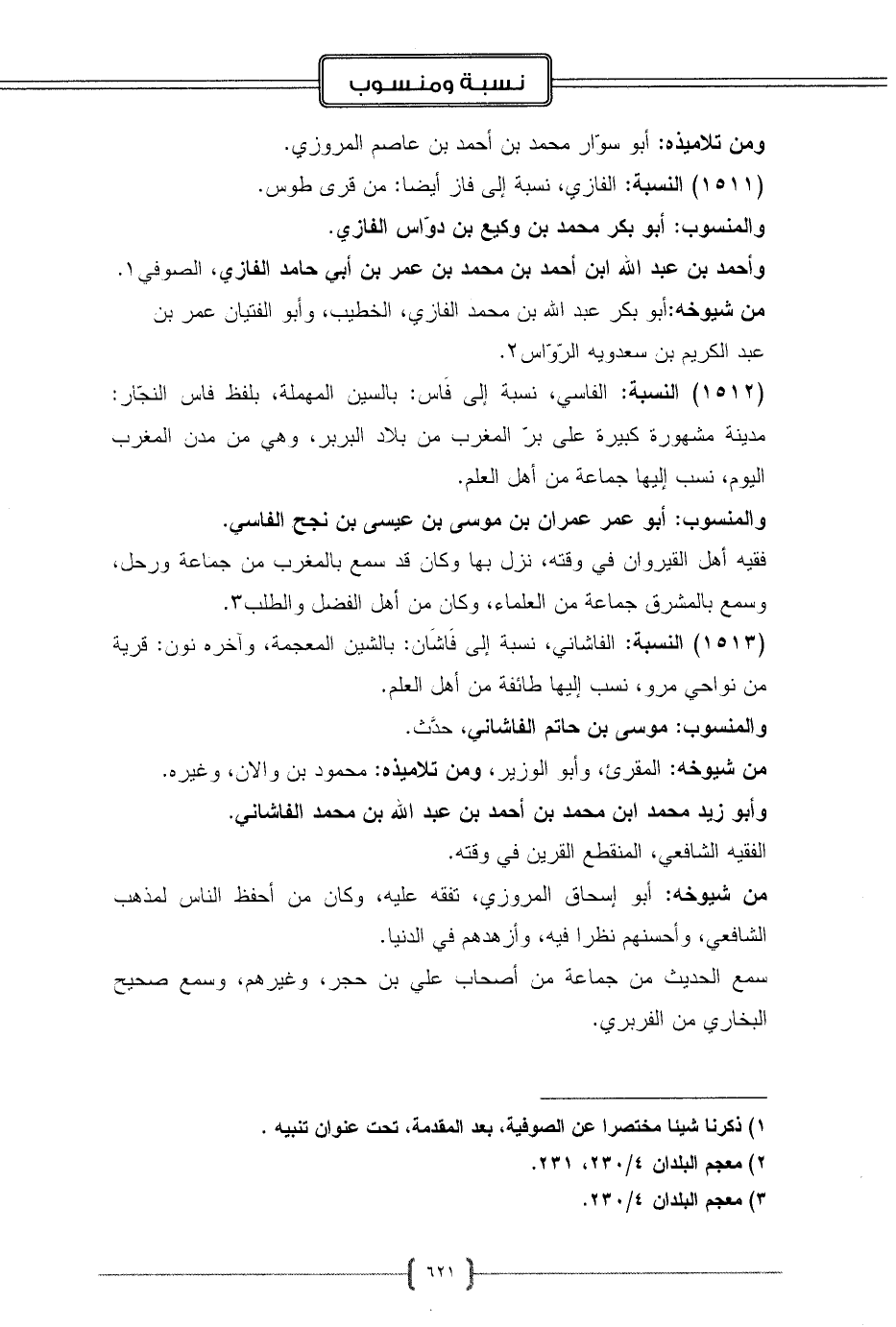 (1513) النسبة: الفاشاني، نسبة إلى فَاشَان: بالشين المعجمة، وآخره نون: قرية من نواحي مرو، نسب إليها طائفة من أهل العلم.