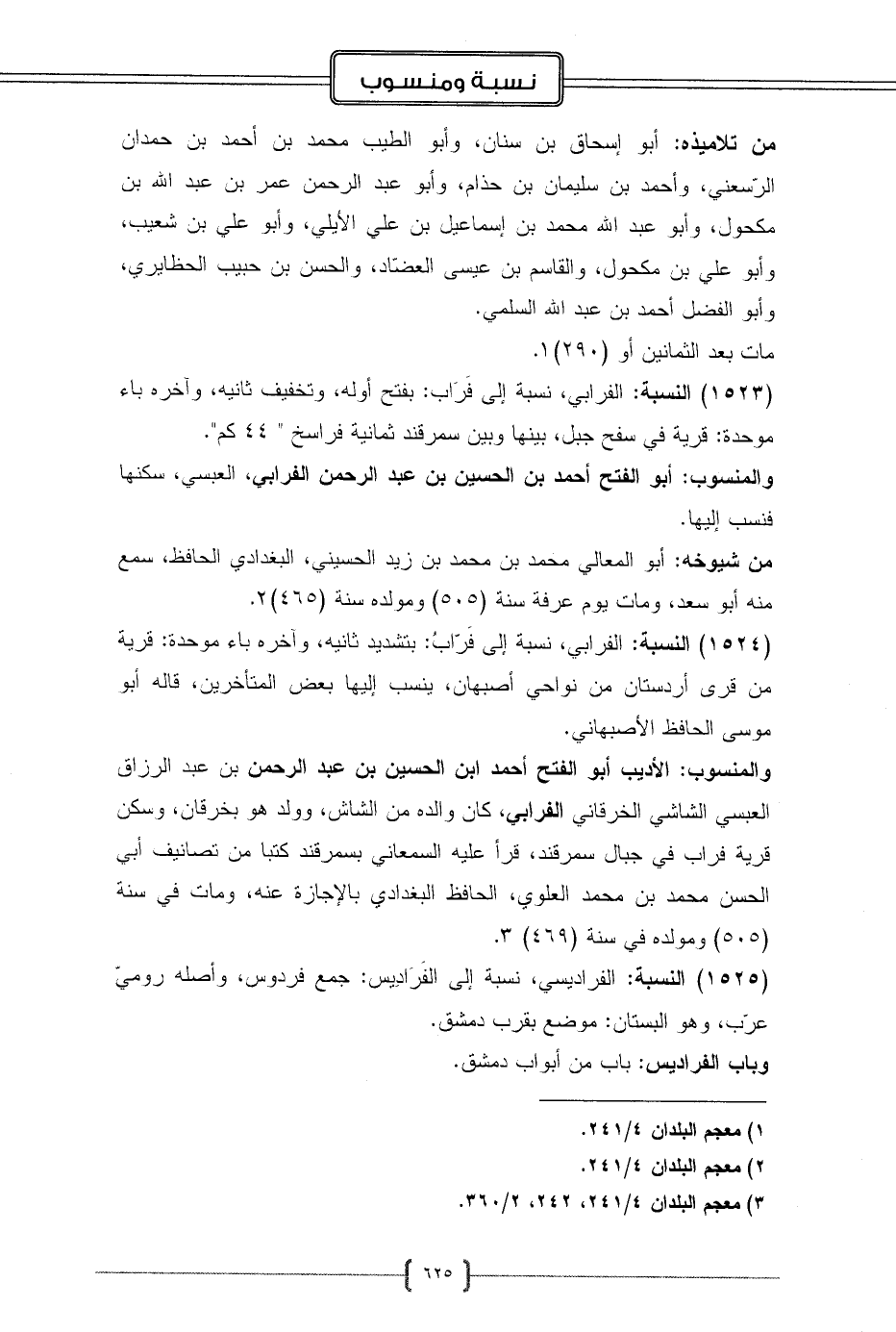 (1523) النسبة: الفرابي، نسبة إلى فَرَاب: بفتح أوله، وتخفيف ثانيه، وآخره باء موحدة: قرية في سفح جبل، بينها وبين سمرقند ثمانية فراسخ " 44 كم".